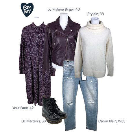 Neule, farkut ja nahkatakki ovat arjen klassikkokolmikko. Kokonaisuus toimii töissä, vapaa-ajalla ja viikonlopun menoissa – lisää vain huivi ja vaihda kengät tilanteen mukaan.