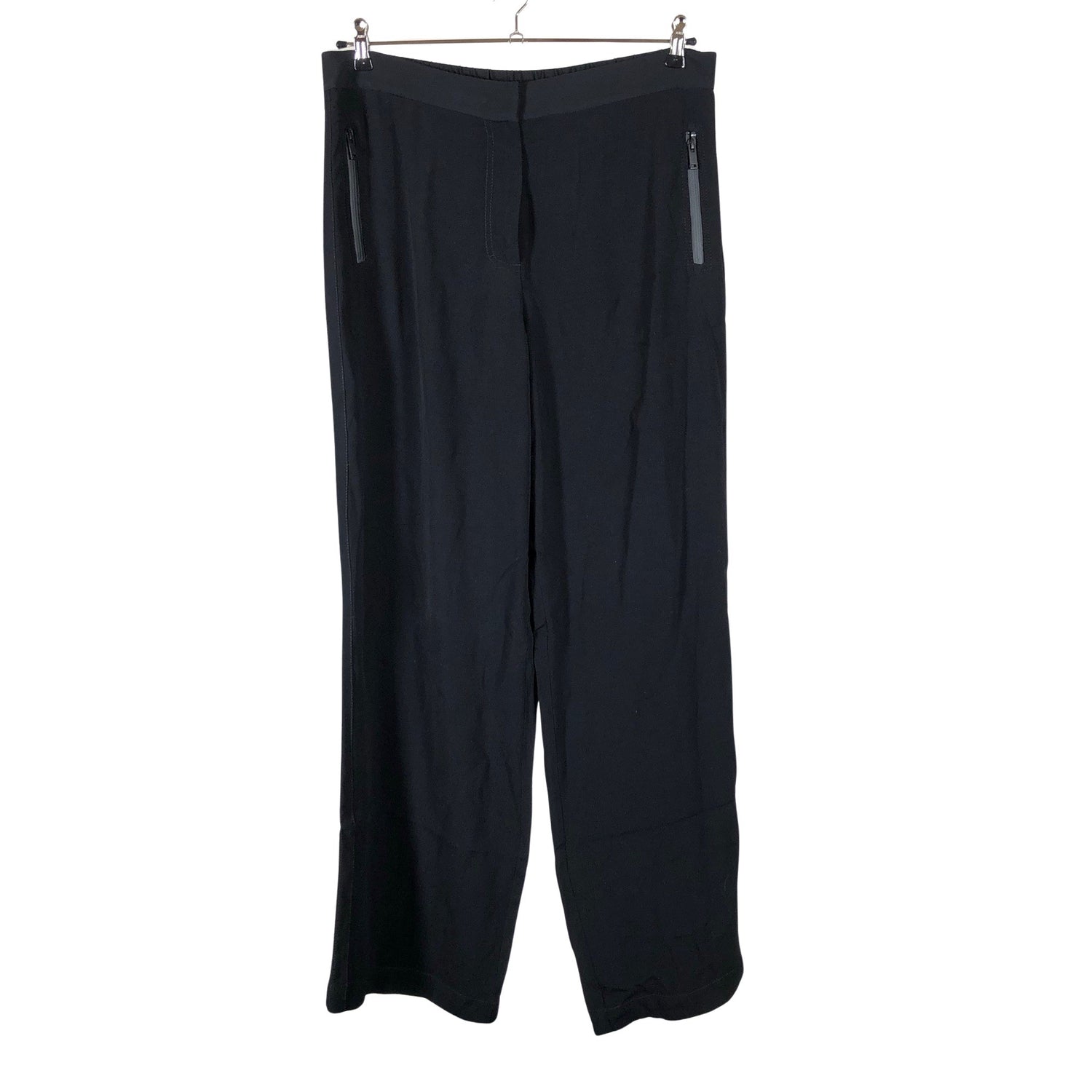 Joustava vyötärö. Leveät lahkeet. Tuotteen taskuissa on vetoketjut. Materiaali ei jousta. Tuotteen pinnassa on aavistus pesu-/käyttökulumaa. Yleisilme on siisti.