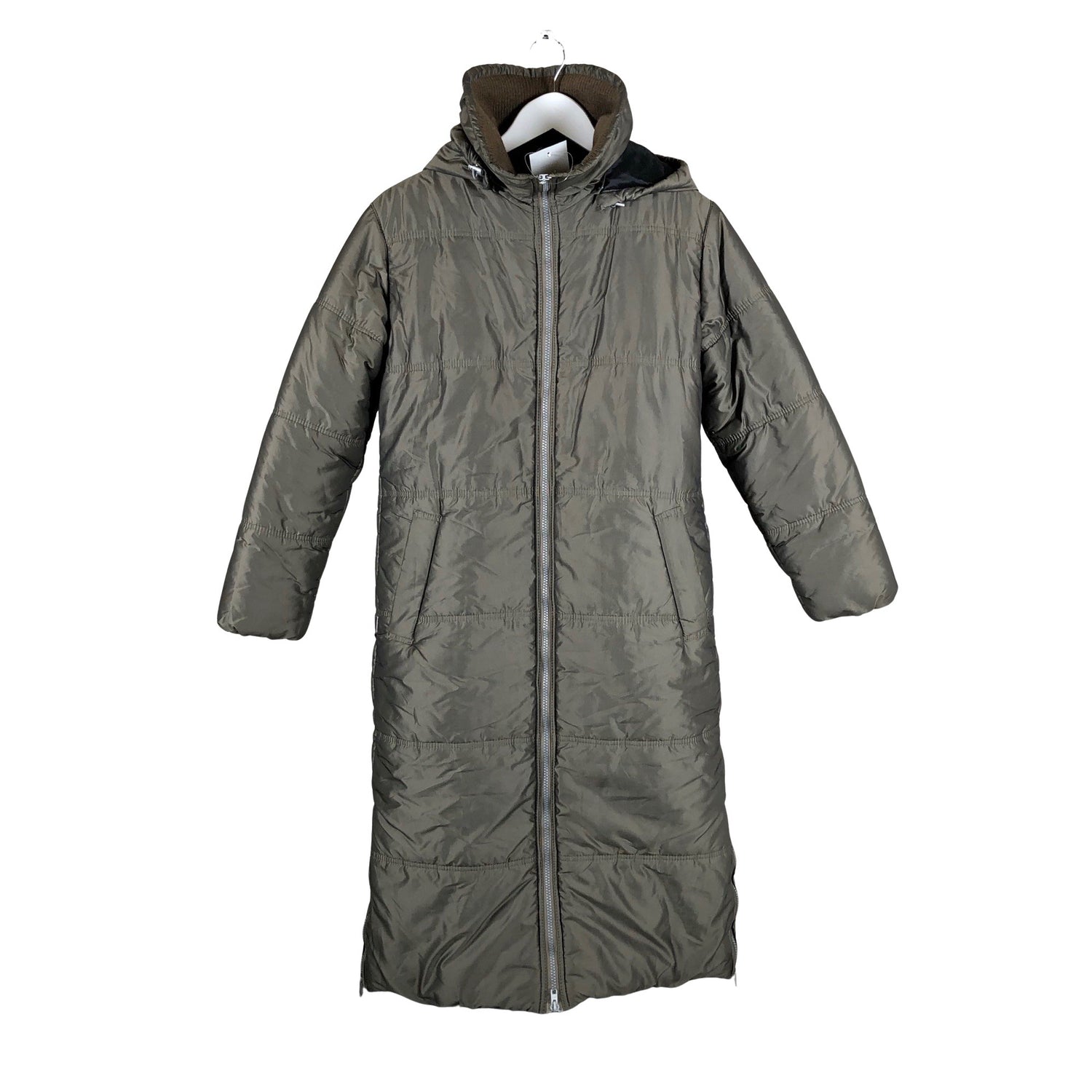 Pitkä malli. Tuotteessa on kaksisuuntainen vetoketju. Sivusaumoissa on vetoketjut. Irrotettava huppu. Tuotteen pinnassa on hieman pesu-/käyttökulumaa. Yleisilme on siisti.