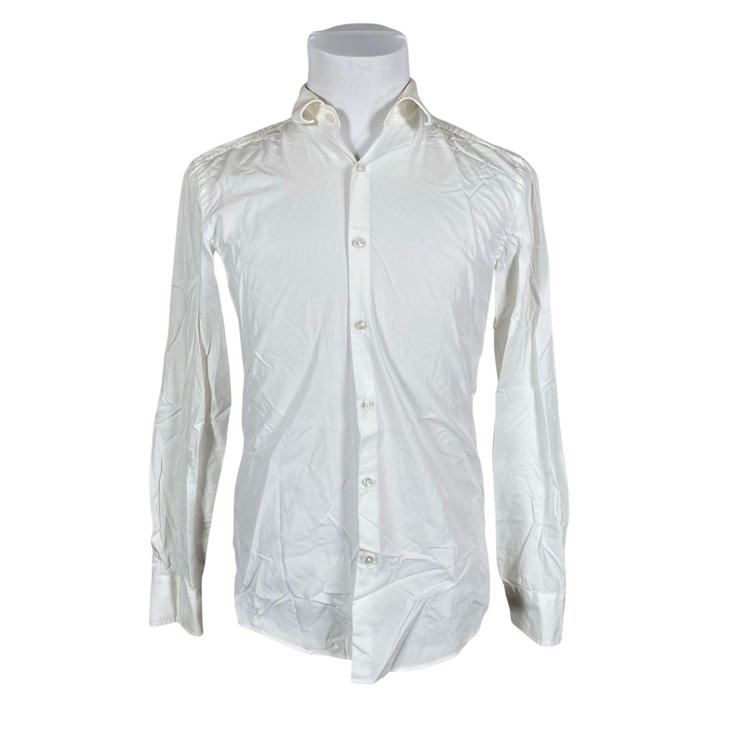 Malli: slim fit. Kauluksen sisäpuolella on aavistus tummentumaa. Tuotteen pinnassa on hieman pesu-/käyttökulumaa. Yleisilme on siisti.