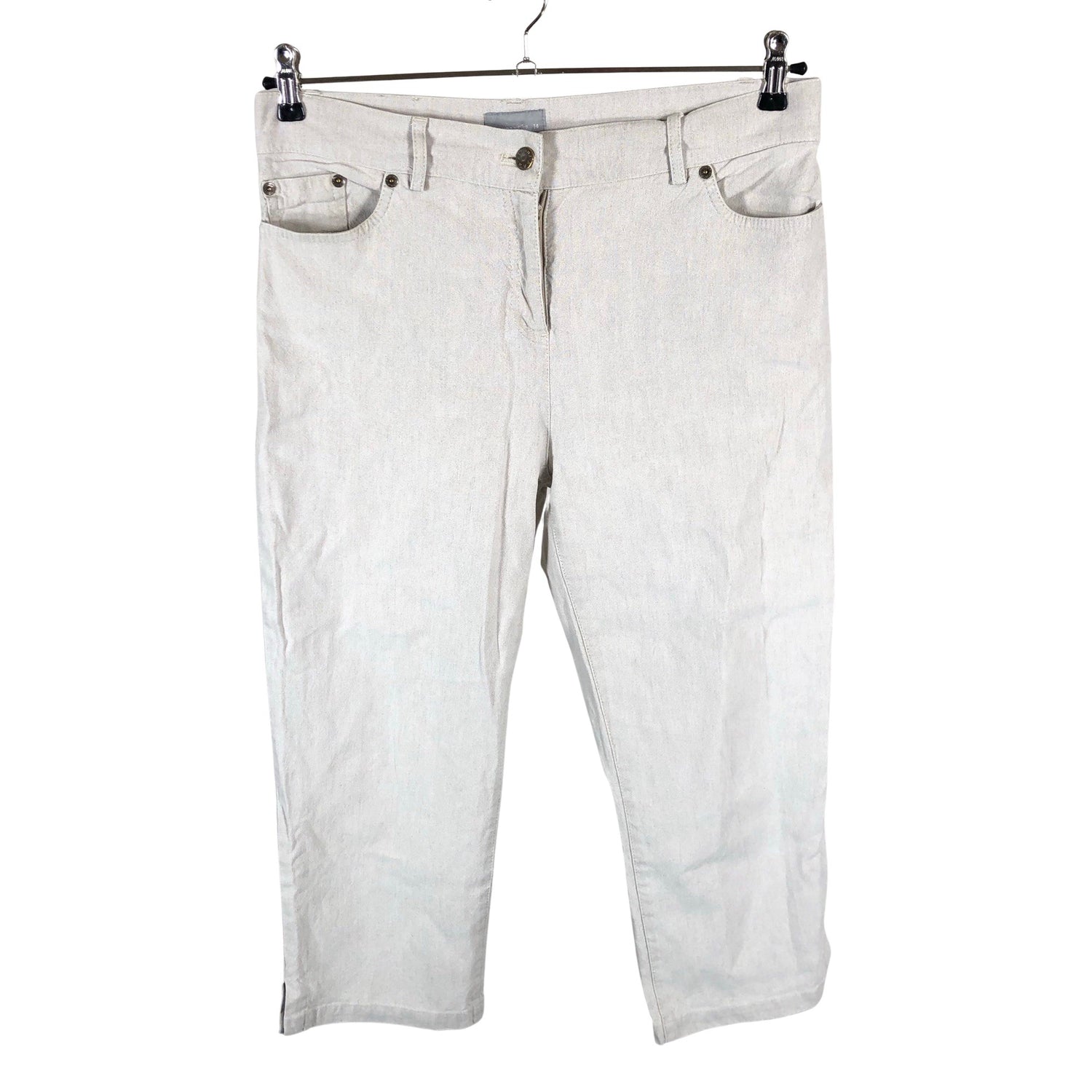 Vajaamittaiset lahkeet. Lahkeissa on halkiot. Tuotteen sauma on hieman auennut, ei vaikuta käyttöön. Tuotteen sisäpuolella on muutama haalea tahra. Tuote on muilta osin hyvässä kunnossa.