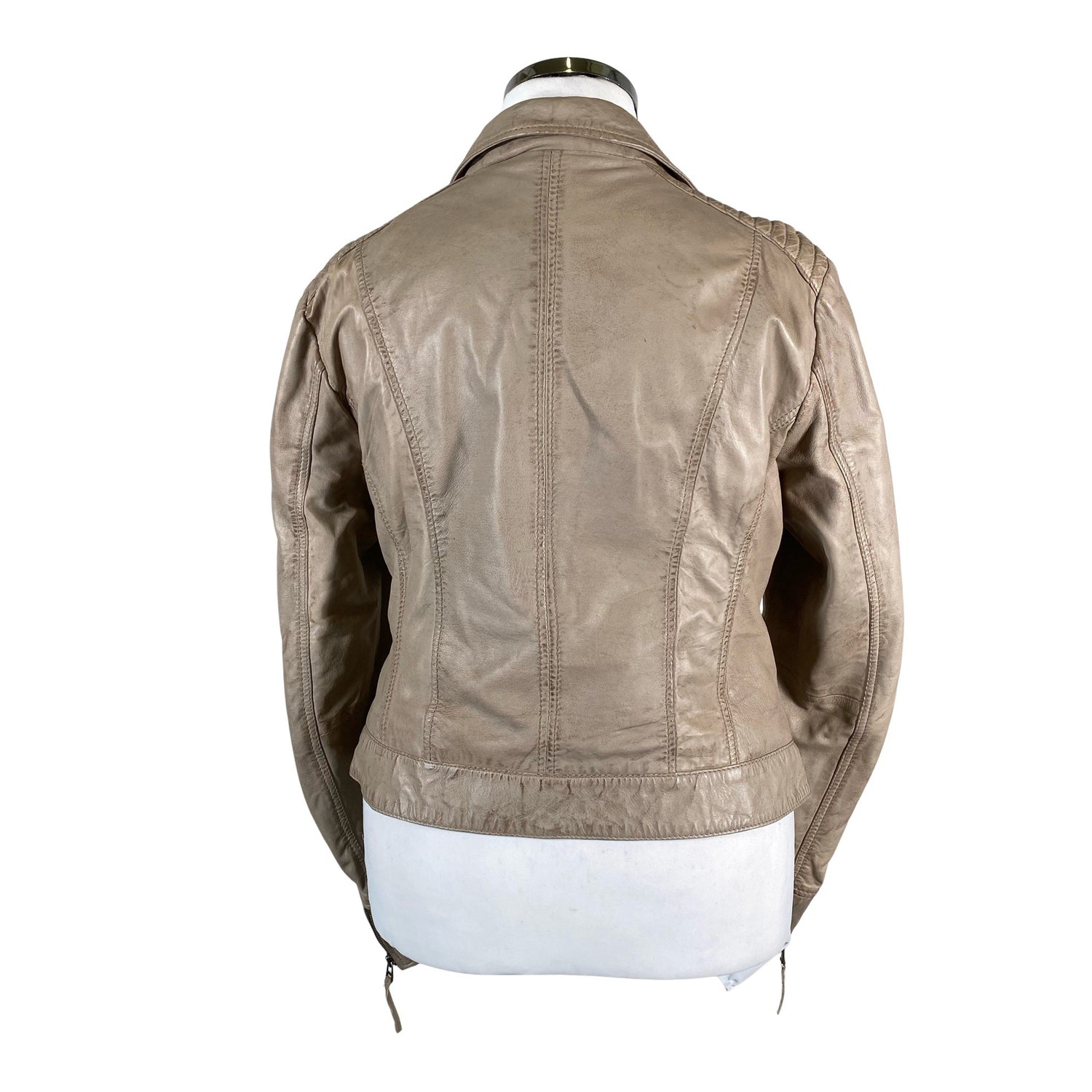 Materiaalitieto puuttuu. Todennäköisesti nahkaa. Biker. Tuotteessa on ohut vuori. Kulutettu kuosi. Tuotteen pinnassa on hieman pesu-/käyttökulumaa. Yleisilme on siisti.