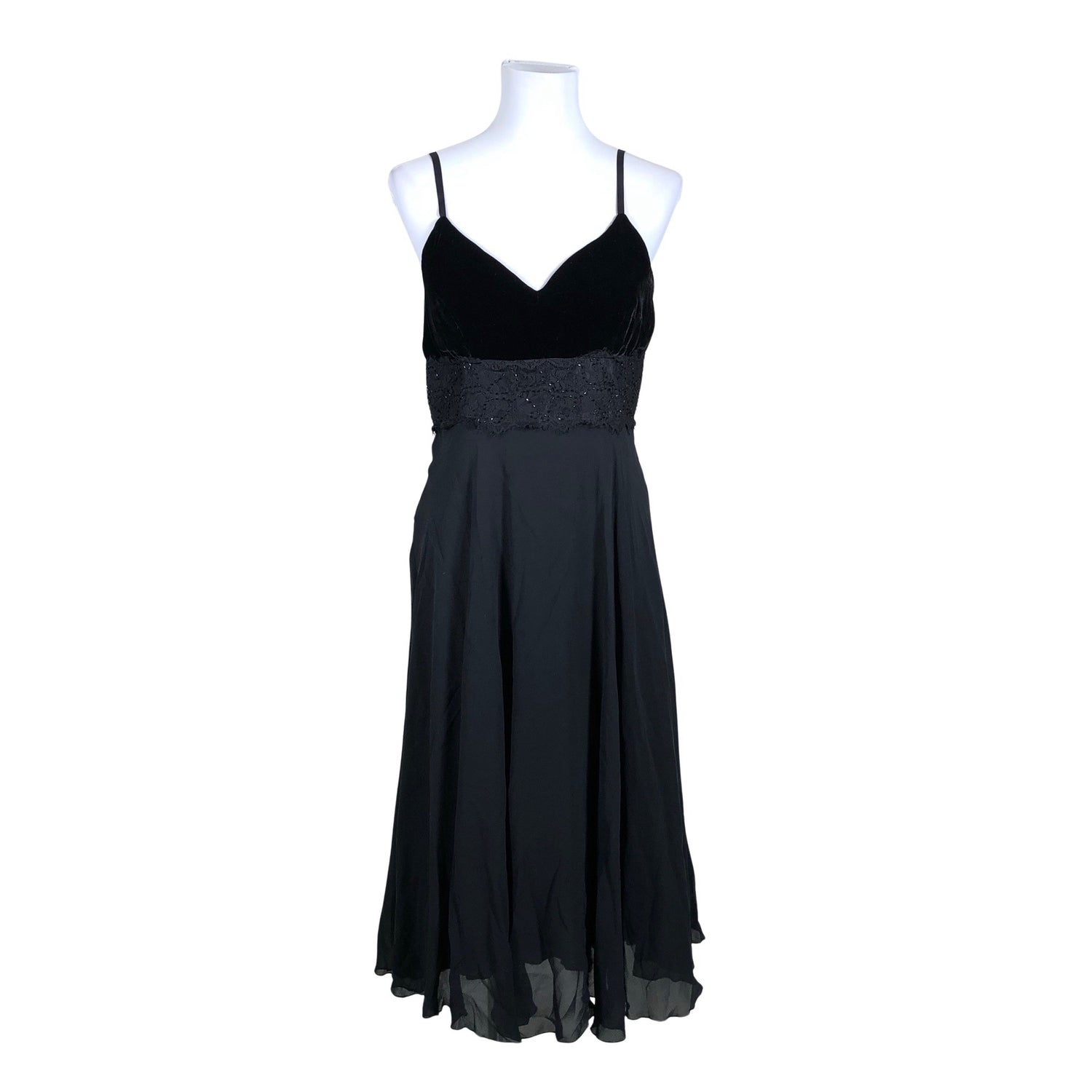 Tuotteen ylä- ja alaosa ovat eri materiaalia. Samettia. Silkkisekoitetta. Vetoketju takana. Tuotteessa on pitsisomiste. Säädettävät olkaimet. Materiaali ei jousta. Tuotteen pinnassa on aavistus pesu-/käyttökulumaa. Yleisilme on siisti.