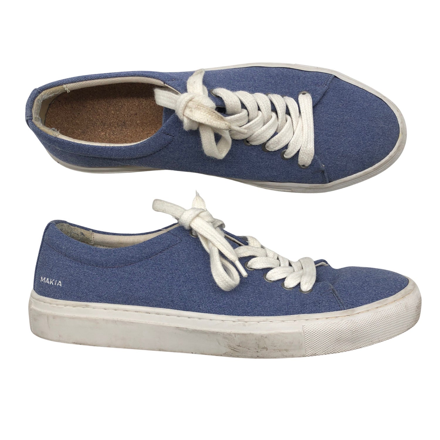 Makia Tennarit, koko 43. Tekstiiliä. Tuotteen sisäpuolella on hieman kulumaa. Tuotteen pinnassa on hieman tummentumaa. Yleisilme on siisti.