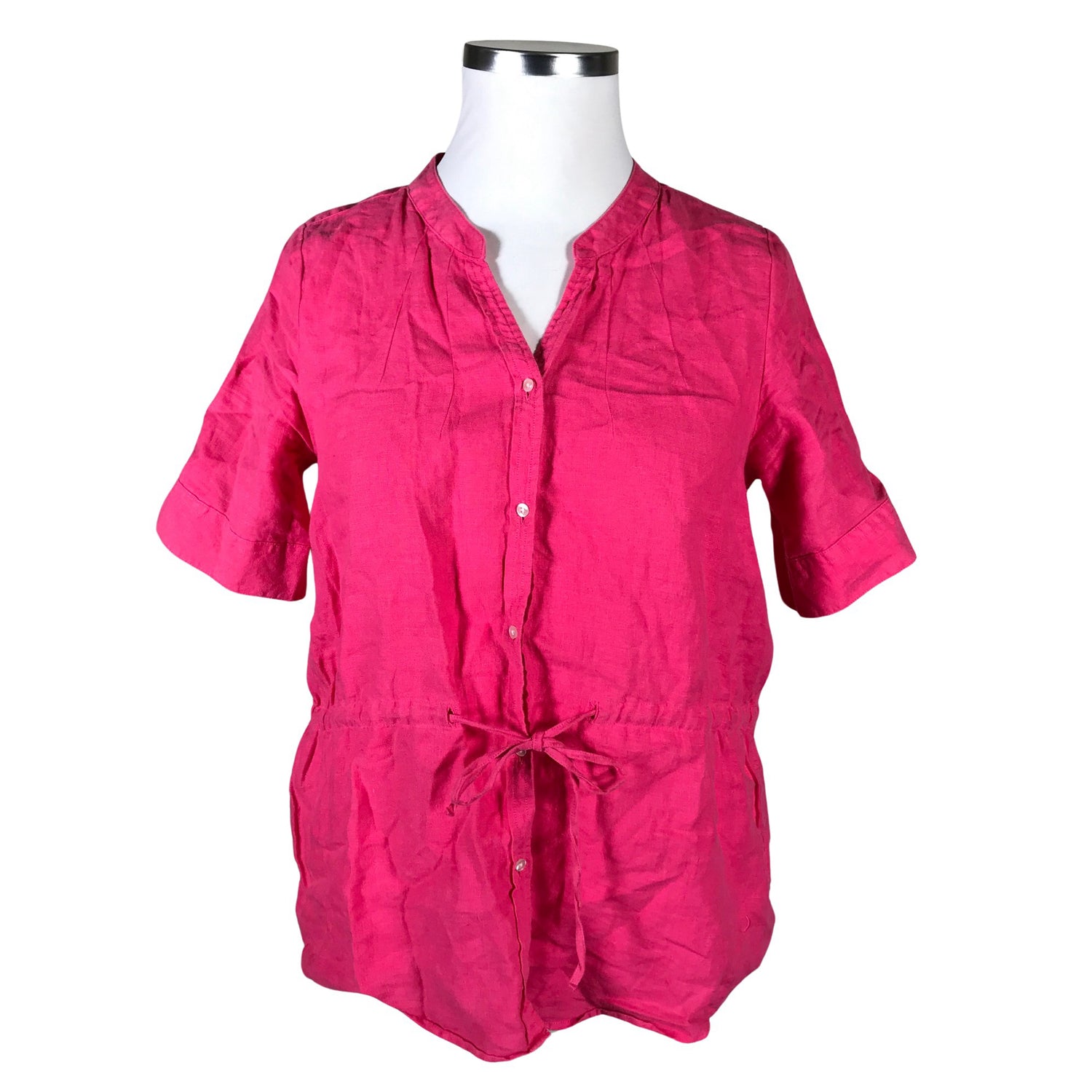 Edessä napit. Kiristysnauha vyötäröllä. Pellavaa. Tuotteen pinnassa on hieman pesu-/käyttökulumaa. Yleisilme on siisti.