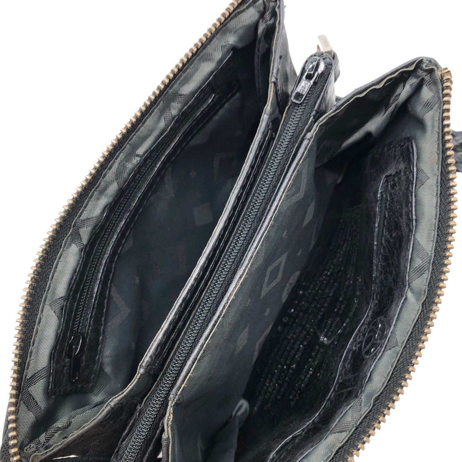 Tuotteessa on vetoketjullinen tasku. Pehmeää nahkaa. Irrotettava olkahihna/rannelenkki. Tuotteen pinnassa on hieman pesu-/käyttökulumaa. Yleisilme on siisti.