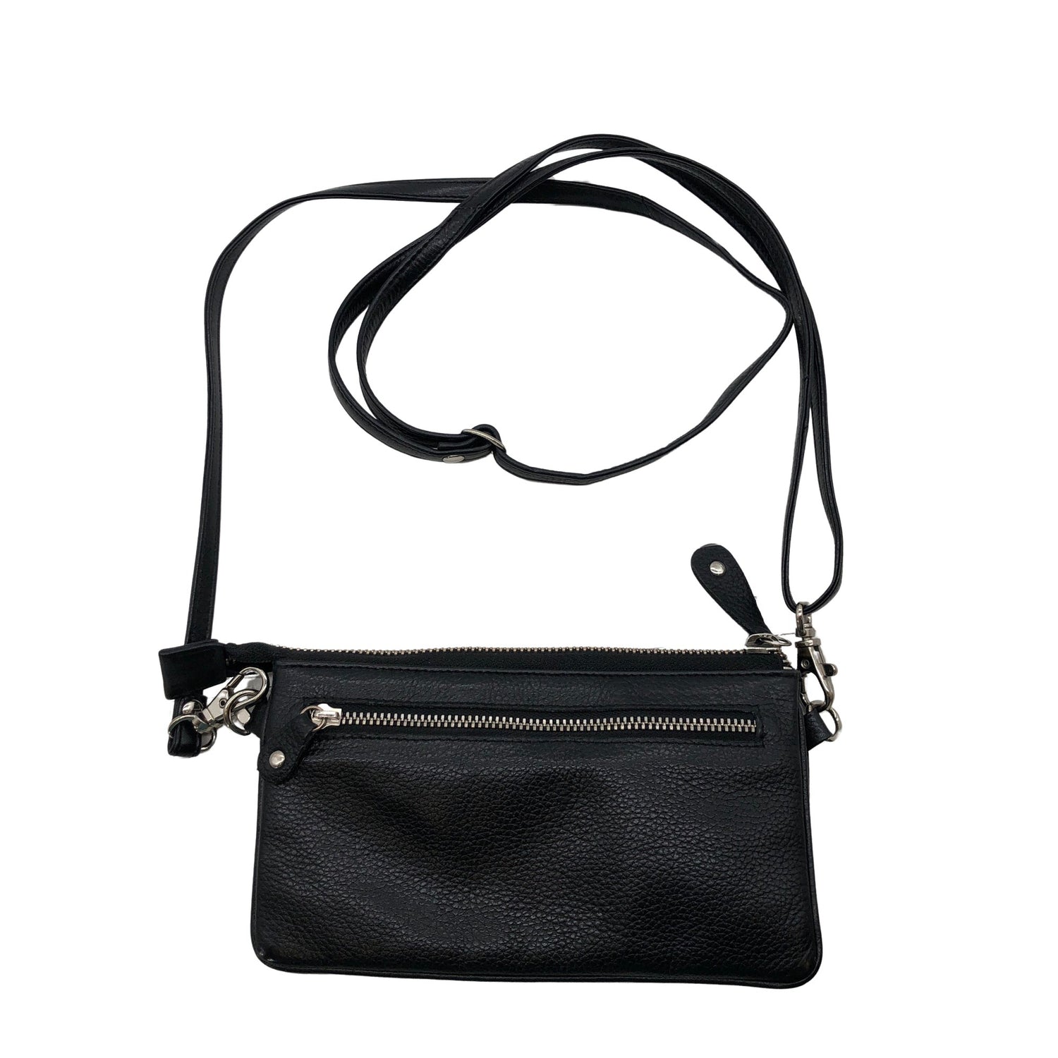 Crossbody. Tuotteen taskuissa on vetoketjut. Olkahihnan pituus on säädettävissä. Irrotettava olkahihna/rannelenkki. Tuotteen sisäpuolella on aavistus värjäymää. Vuorikankaan sauma on auennut, ei vaikuta käyttöön. Yleisilme on siisti.