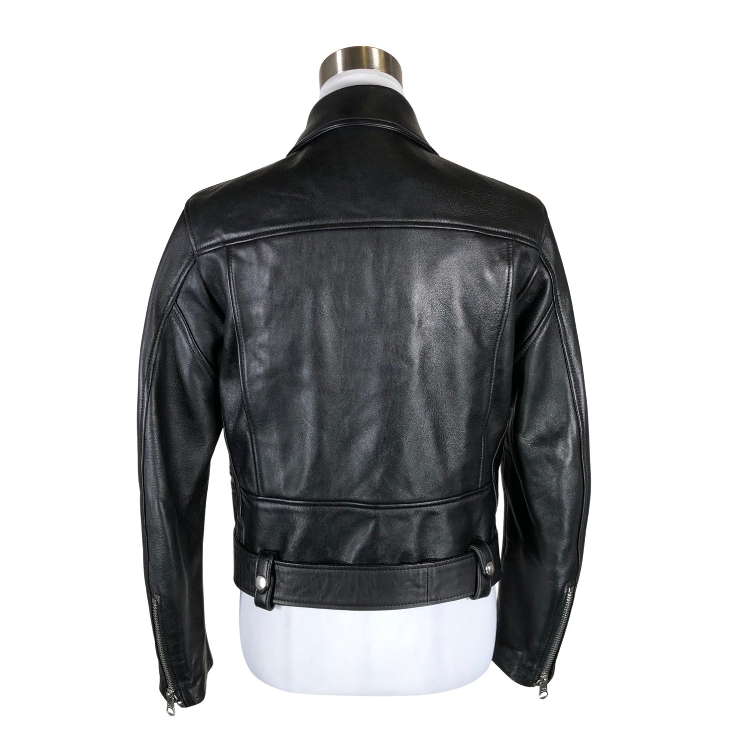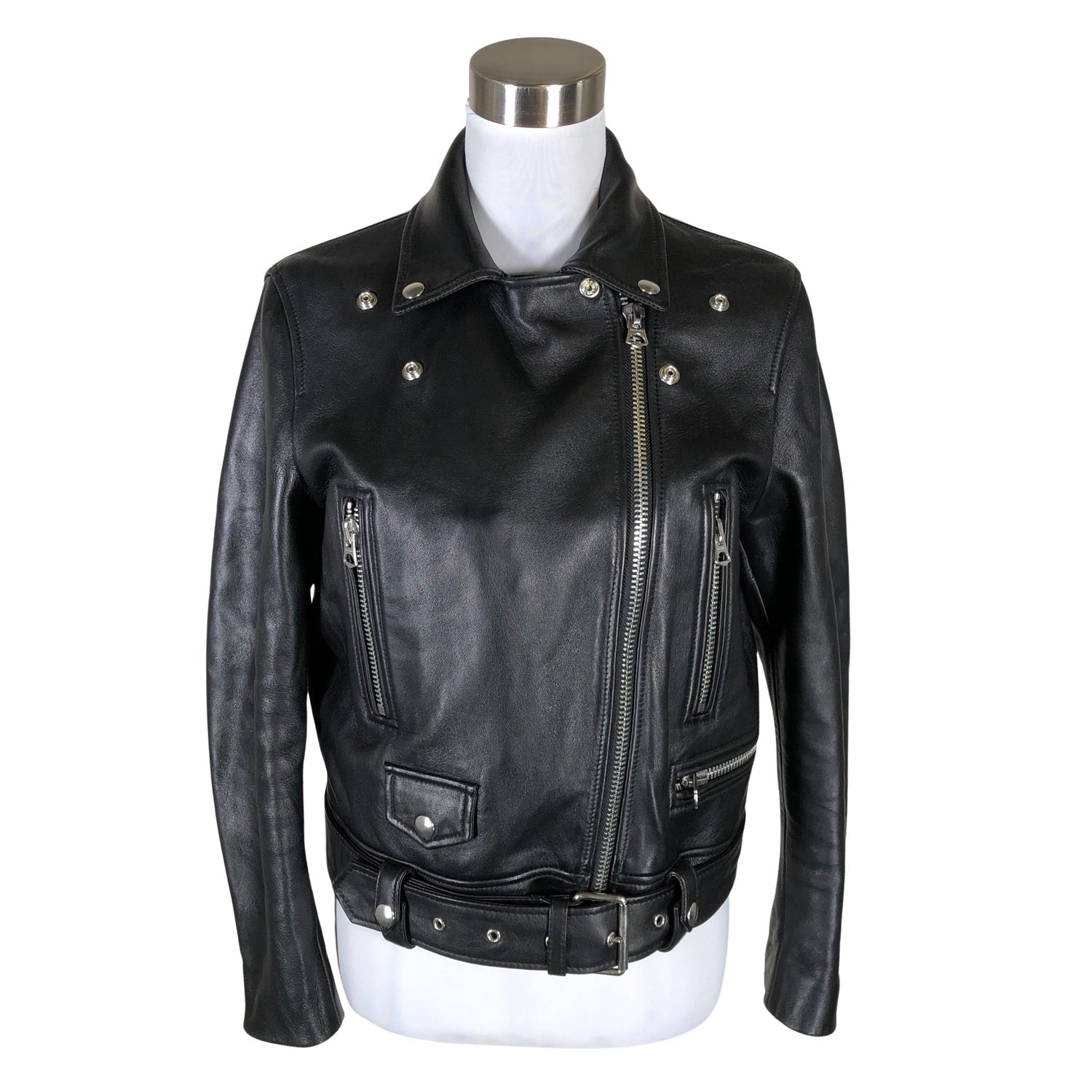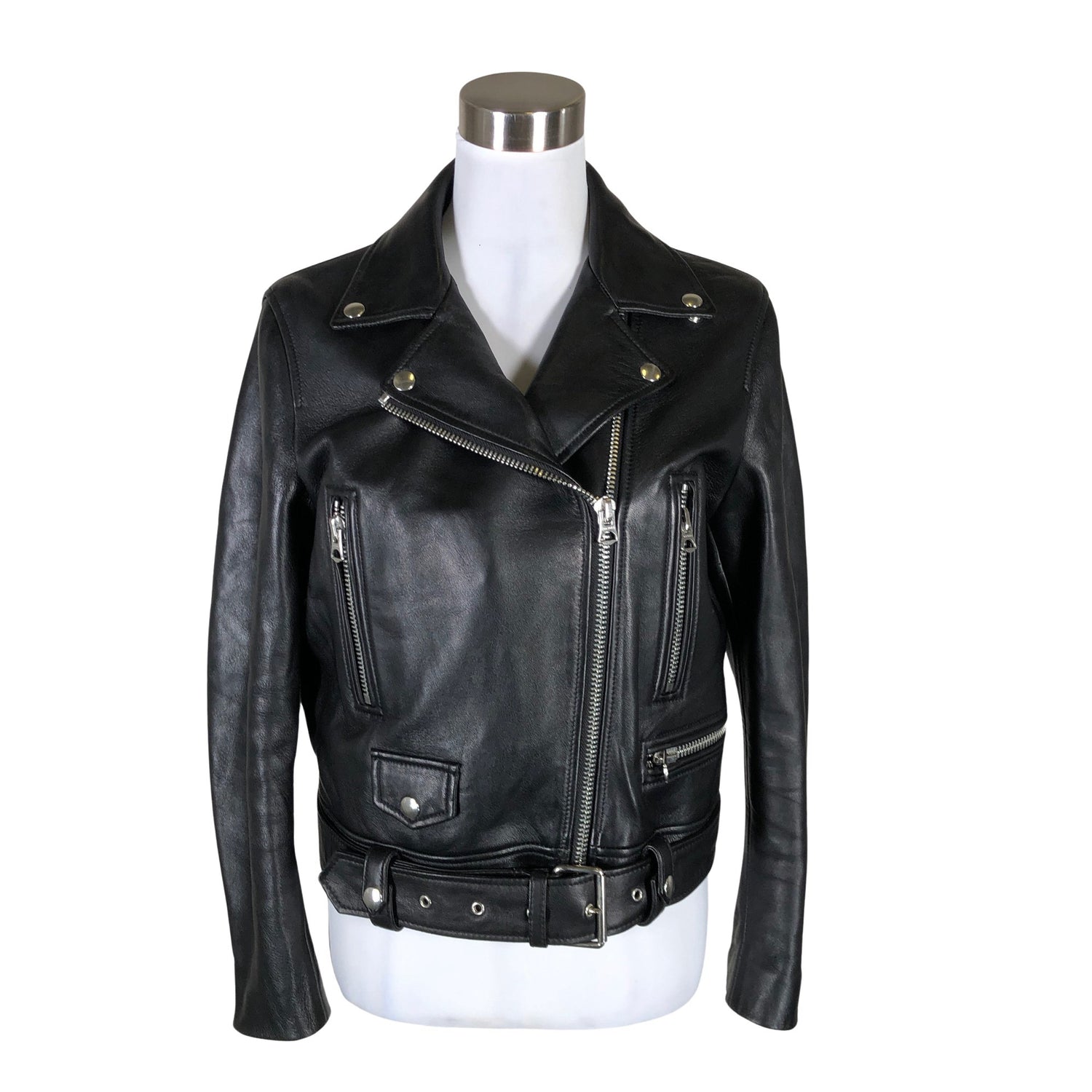 Biker. Pehmeää nahkaa. Tuotteeseen kuuluu vyö. Hihoissa on vetoketjut.