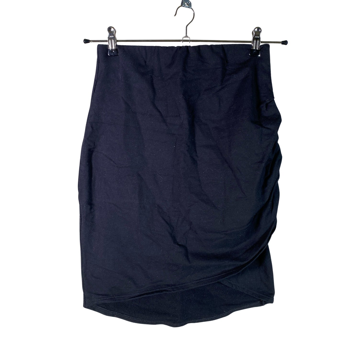Epäsymmetrinen helma. Joustava vyötärö. Tuotteen pinnassa on hieman pesu-/käyttökulumaa. Yleisilme on siisti.