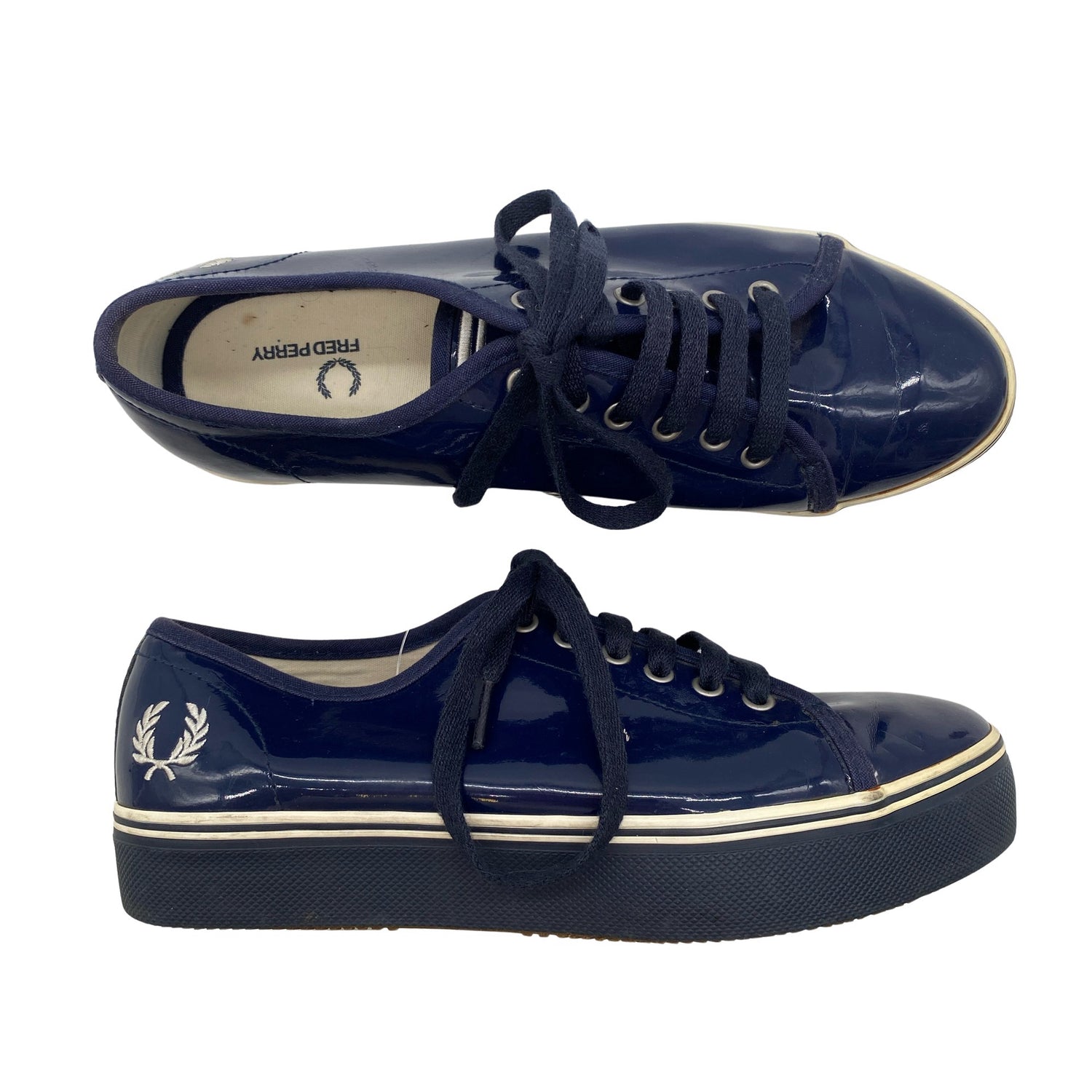 Fred Perry Tennarit, koko 40. Paksut pohjat. Tuotteessa on hieman liimausjälkeä. Tuotteen pinnassa on hieman pesu-/käyttökulumaa. Yleisilme on siisti.