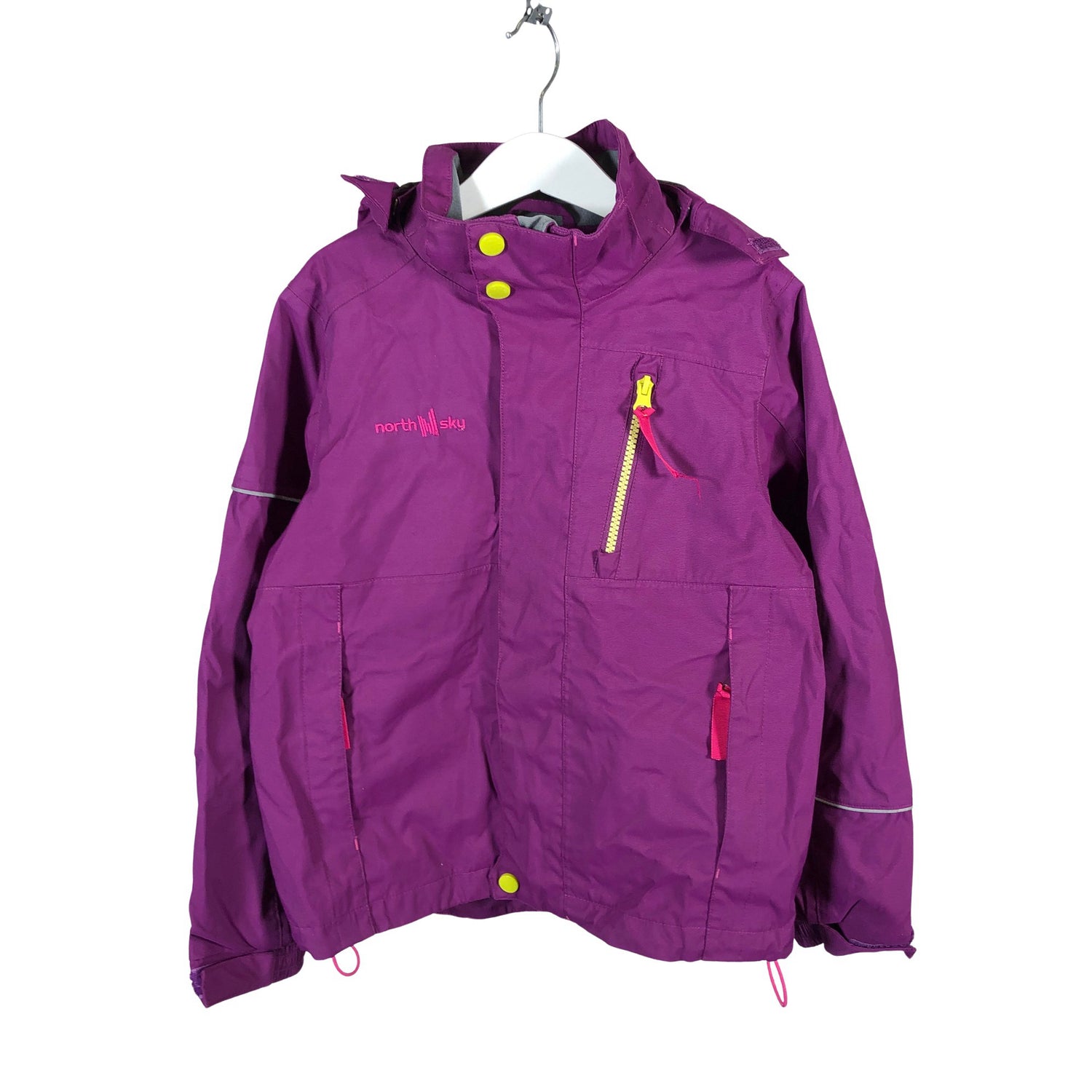 North Sky Välikausitakki, koko 128 - 134. Irrotettava huppu. Tuotteessa on kiristysnyöri helmassa. Tuotteen pinnassa on aavistus pesu-/käyttökulumaa. Yleisilme on siisti.