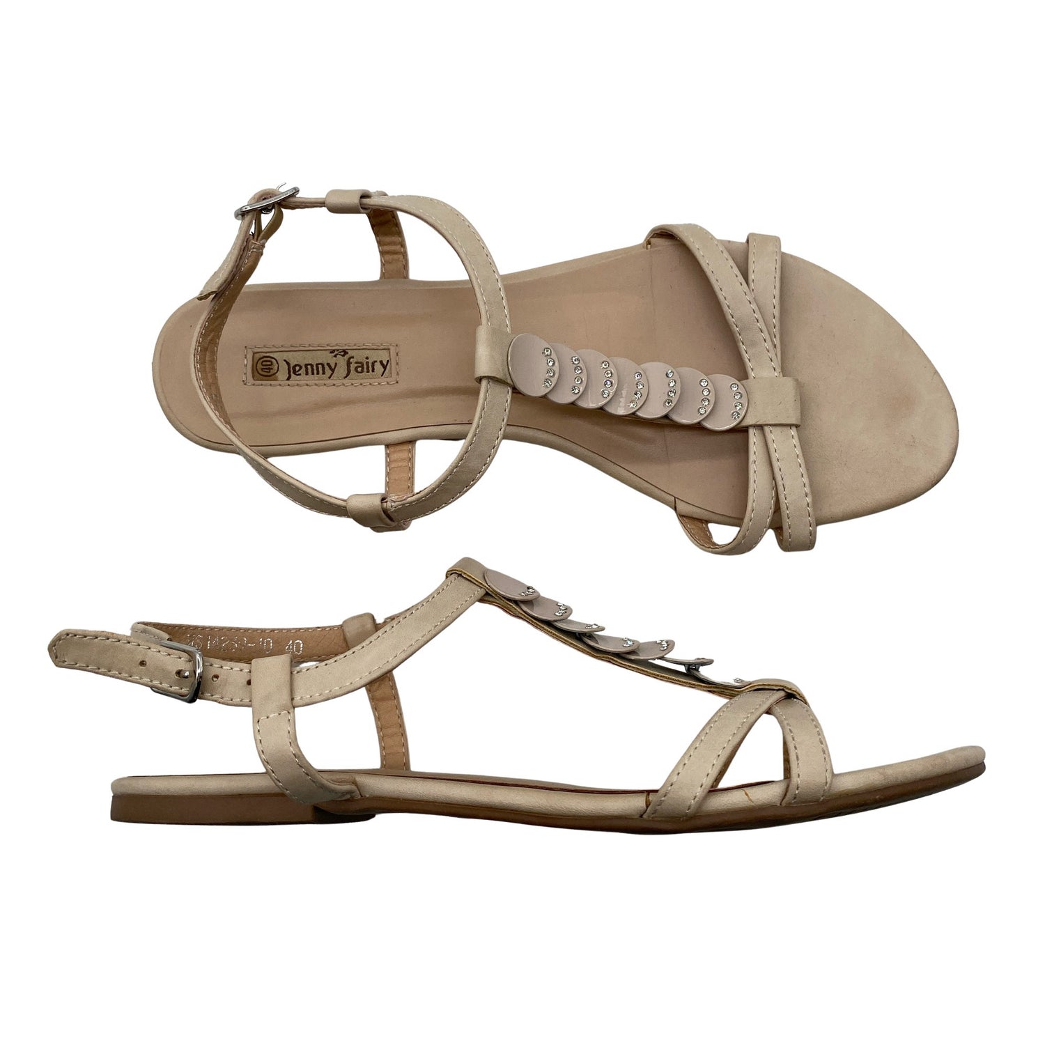Jenny Fairy Sandaalit, koko 40. Solkikiinnitys. Tuotteen sauma on hieman auennut, ei vaikuta käyttöön. Tuotteen sisäpuolella on aavistus tummentumaa. Tuote on muilta osin hyvässä kunnossa.