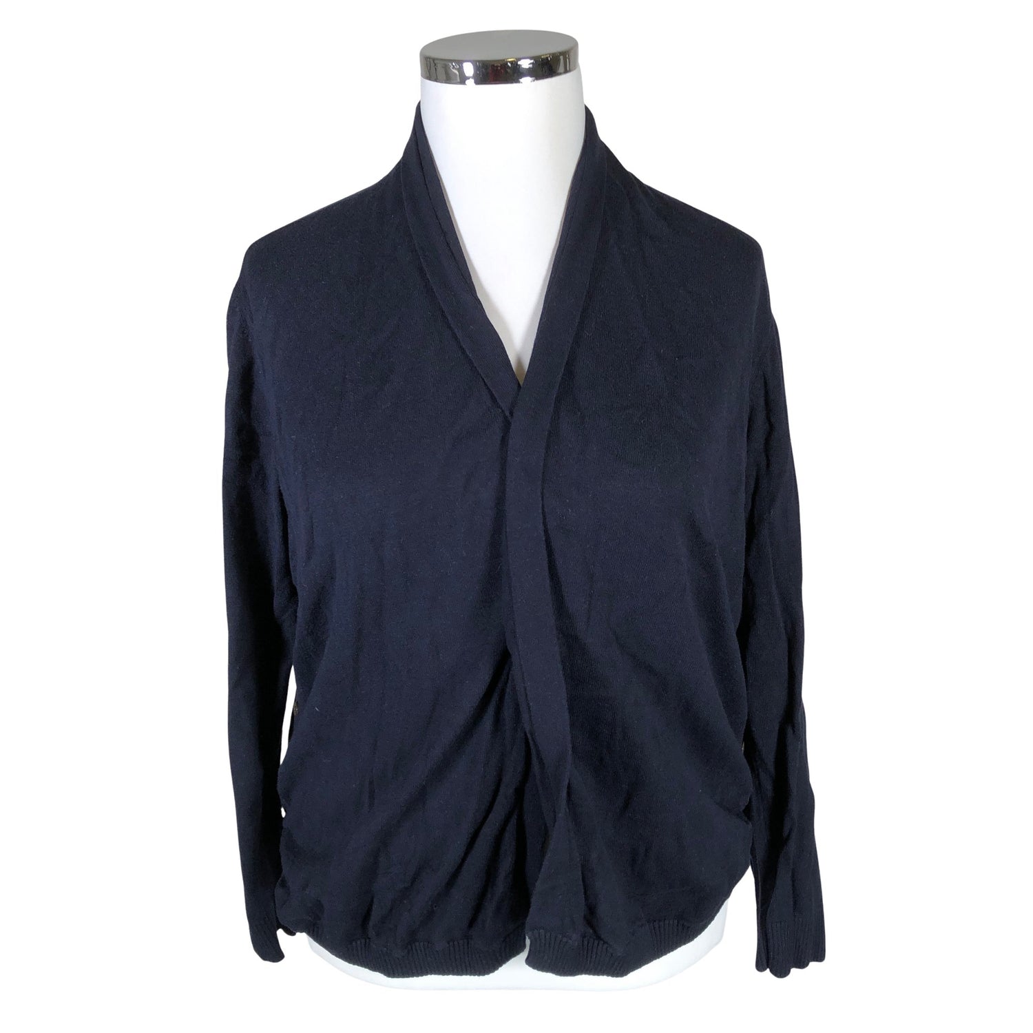 Ei kiinnitystä. Koristenapit. Pyöristetty helma. Materiaali joustaa. Tuotteen pinnassa on hieman pesu-/käyttökulumaa. Yleisilme on siisti.