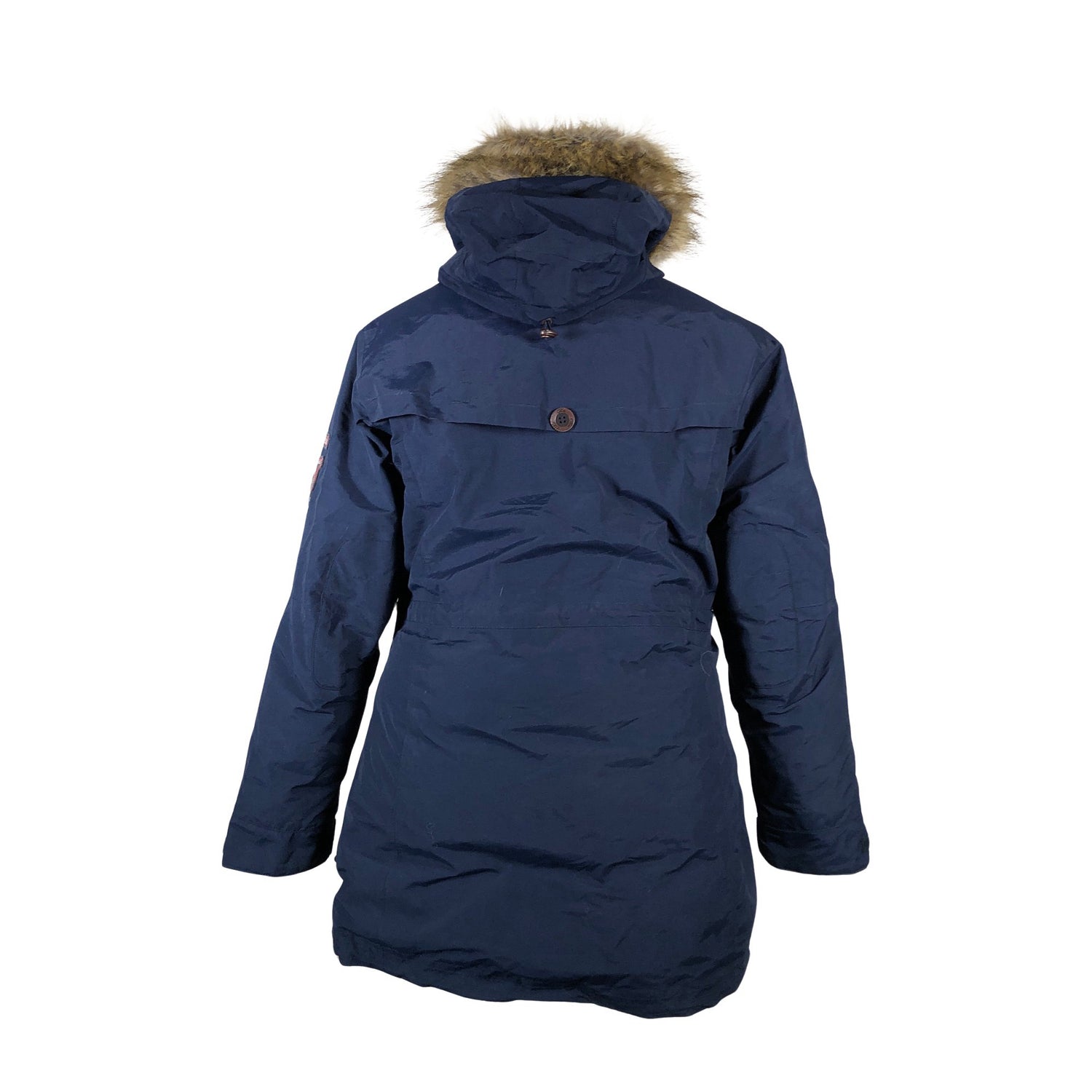 Tuotteessa on kiristysnyöri helmassa. Irrotettava karvakaulus. Tuotteen pinnassa on aavistus pesu-/käyttökulumaa. Yleisilme on siisti.