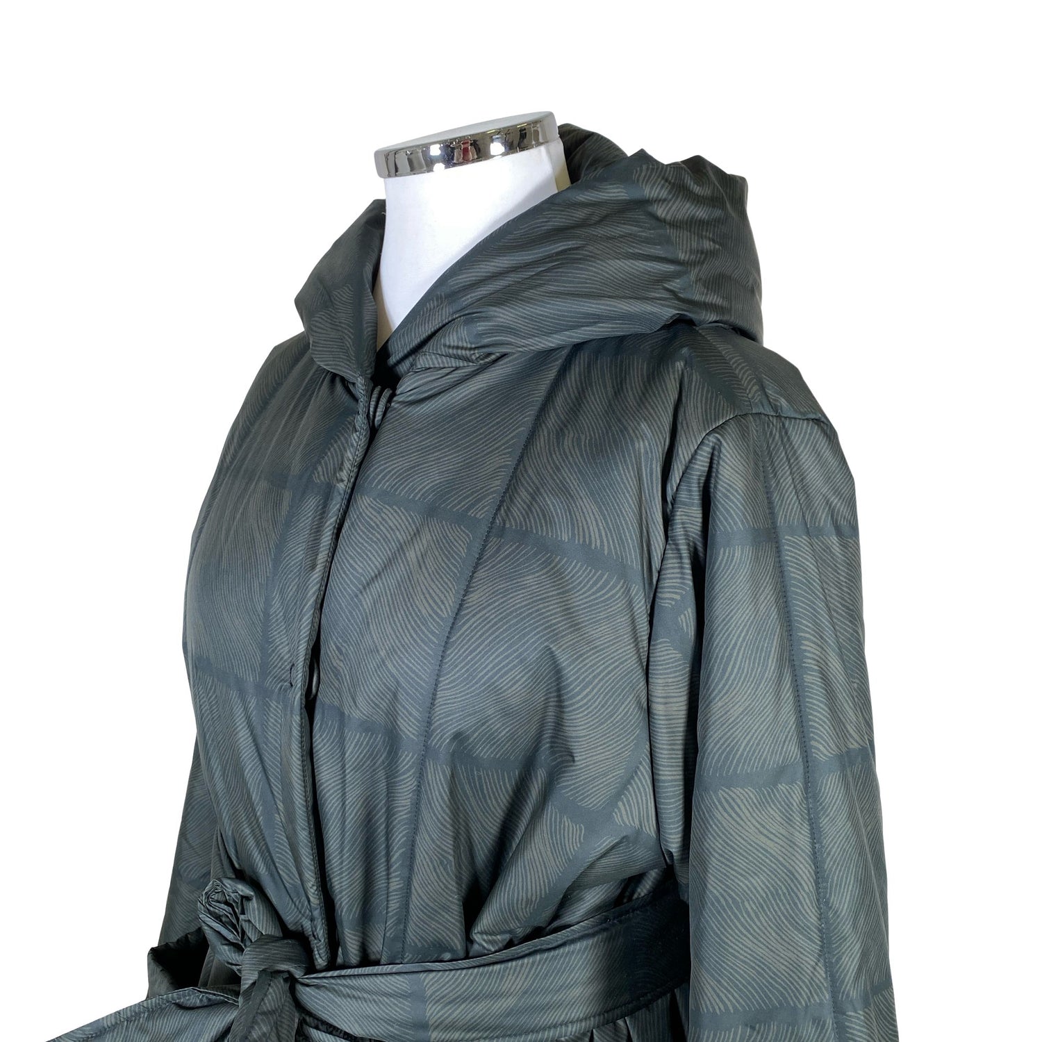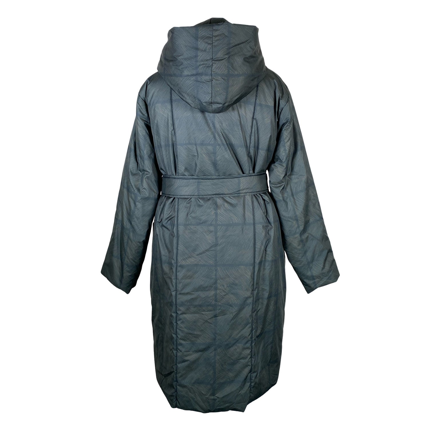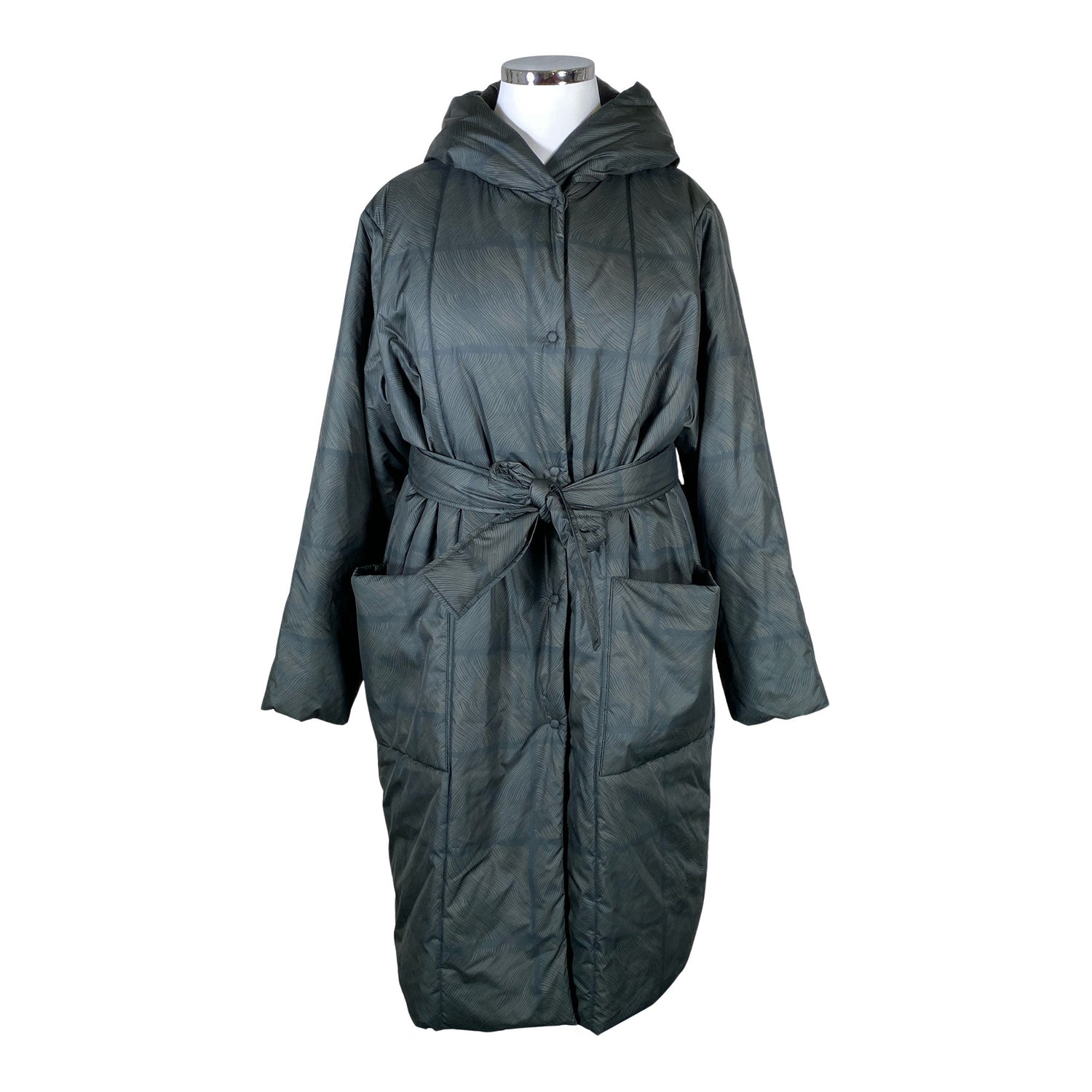 Tuotteessa on huppu. Tuotteeseen kuuluu vyö. Väljä malli.