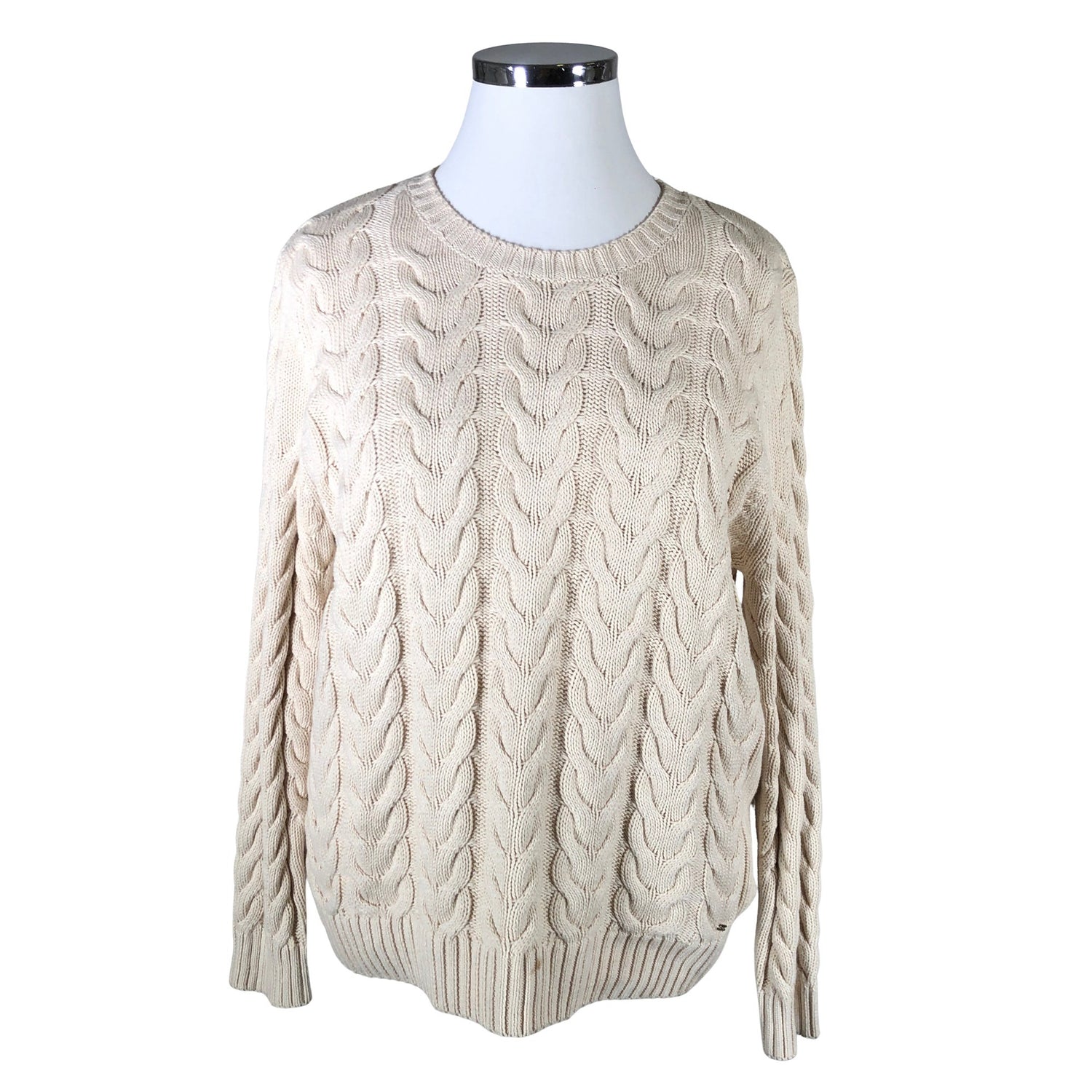 Paksua neulosta. Puuvillaa. Tuotteen pinnassa on pieni tahra. Lähtee todennäköisesti pesussa. Tuote on muilta osin hyvässä kunnossa.