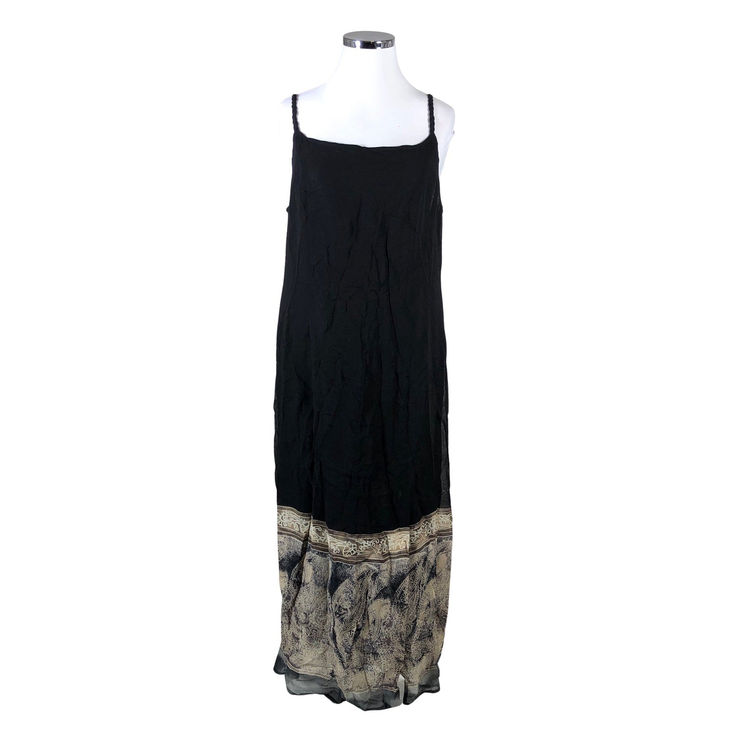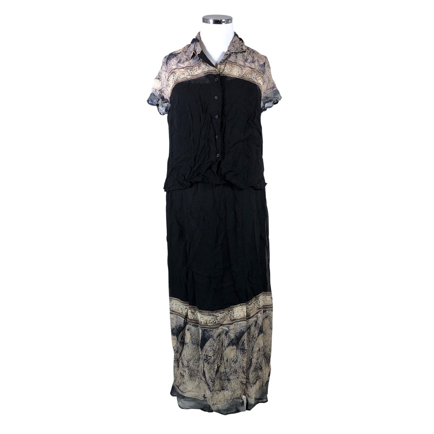 Setti. Läpikuultavaa materiaalia. Vaatteen mitta: rinnanympärys 1/2 mitta (kainalo-kainalo): 61 cm. Olka-helma pituus: 61 cm. Tuote on hieman ryppyinen. Tuotteen pinnassa on aavistus pesu-/käyttökulumaa. Yleisilme on siisti.
