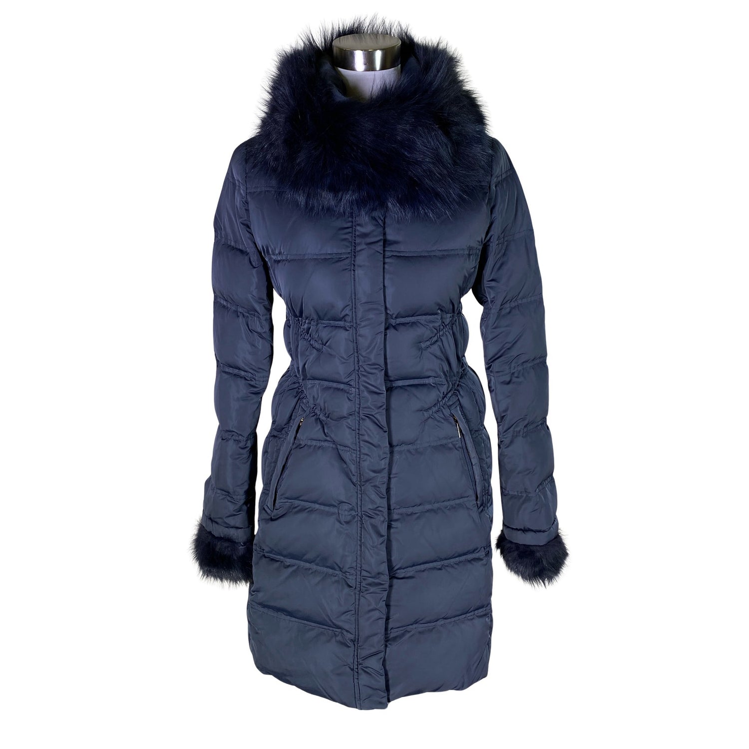 Irrotettava karvakaulus. Untuvat/toppaus on hieman kasassa. Vedin on hieman rikki, ei vaikuta käyttöön. Tuotteen pinnassa on hieman pesu-/käyttökulumaa. Yleisilme on siisti.