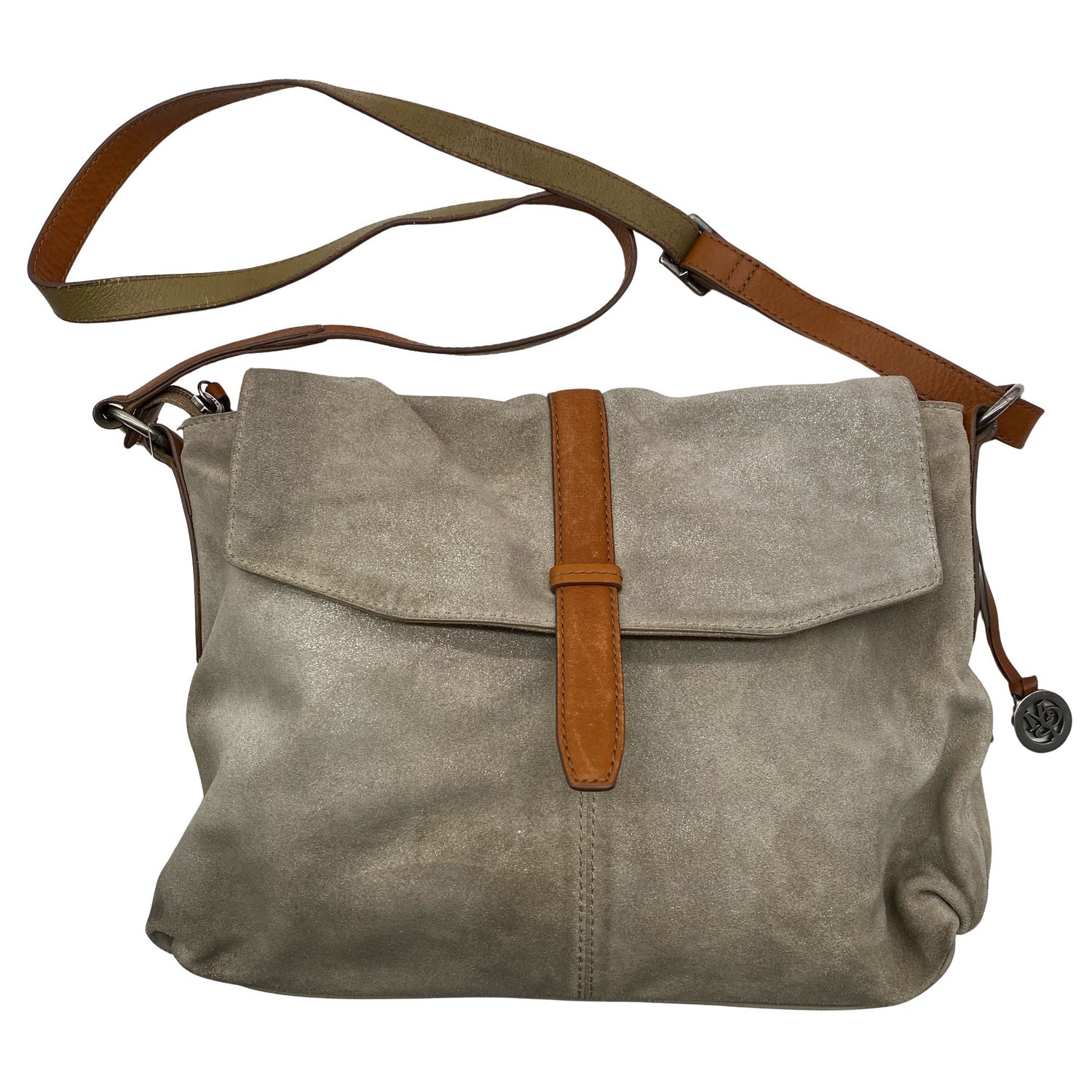 Crossbody. Materiaalitieto puuttuu. Todennäköisesti nahkaa. Mokkamainen pinta. Tuotteen pinnassa on kimalletta. Tuotteen pinnassa on hieman tummentumaa. Tuotteen sisäpuolella on hieman tummentumaa.