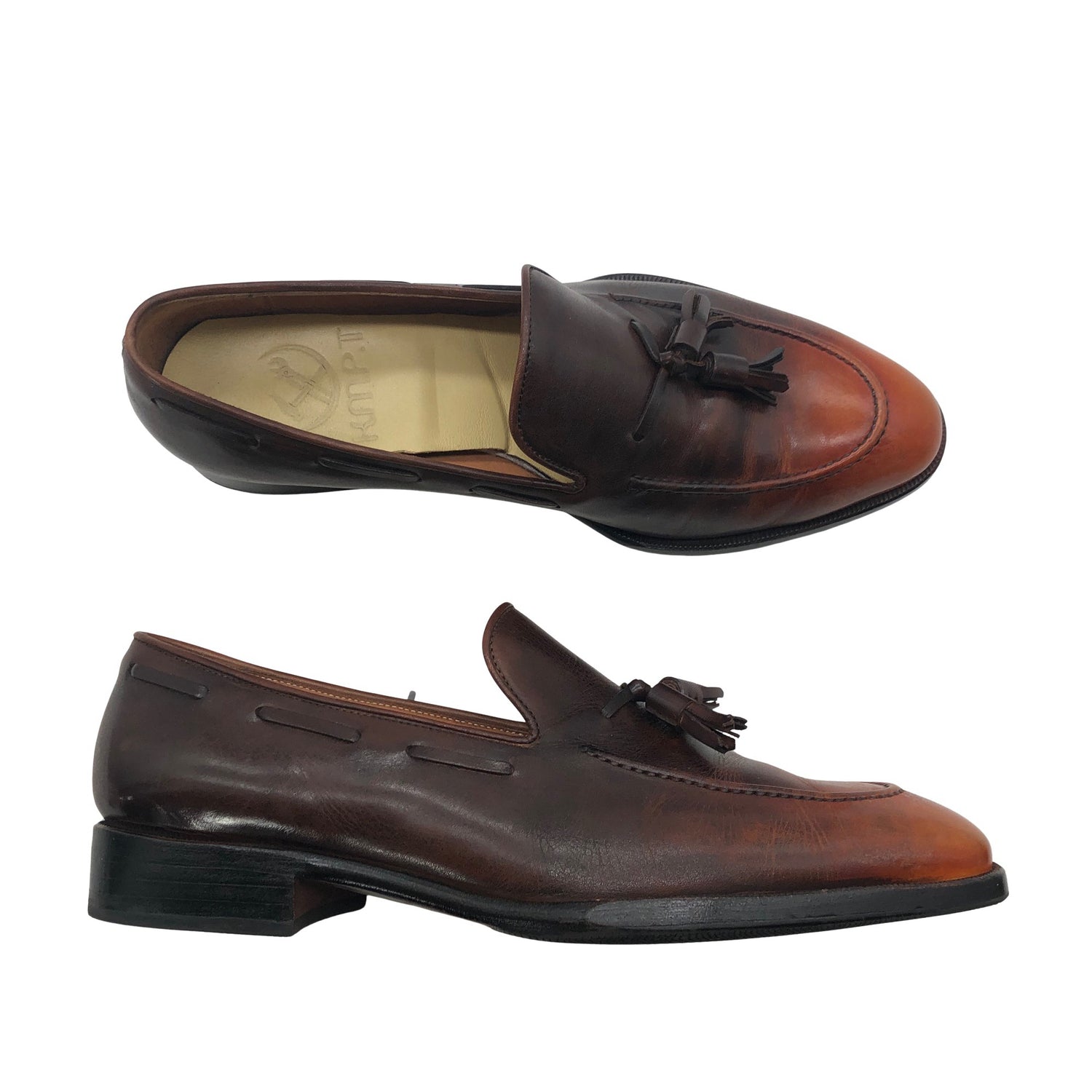 K.M.P.T Loaferit, koko 41. Materiaalitieto puuttuu. Todennäköisesti nahkaa. Kulutettu kuosi.