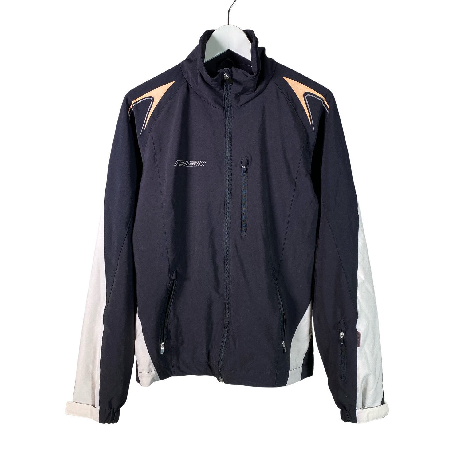 Tuotteessa on kiristysnyöri helmassa. Tuotteen taskuissa on vetoketjut. Tuotteen pinnassa on hieman pesu-/käyttökulumaa. Yleisilme on siisti.