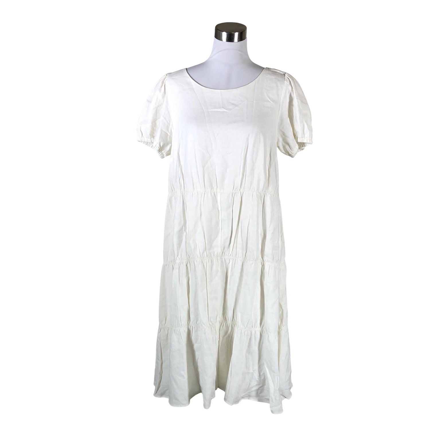 Pellavasekoitetta. Kauluksessa on aavistus tummentumaa. Lähtee todennäköisesti pesussa. Tuote on muilta osin hyvässä kunnossa.