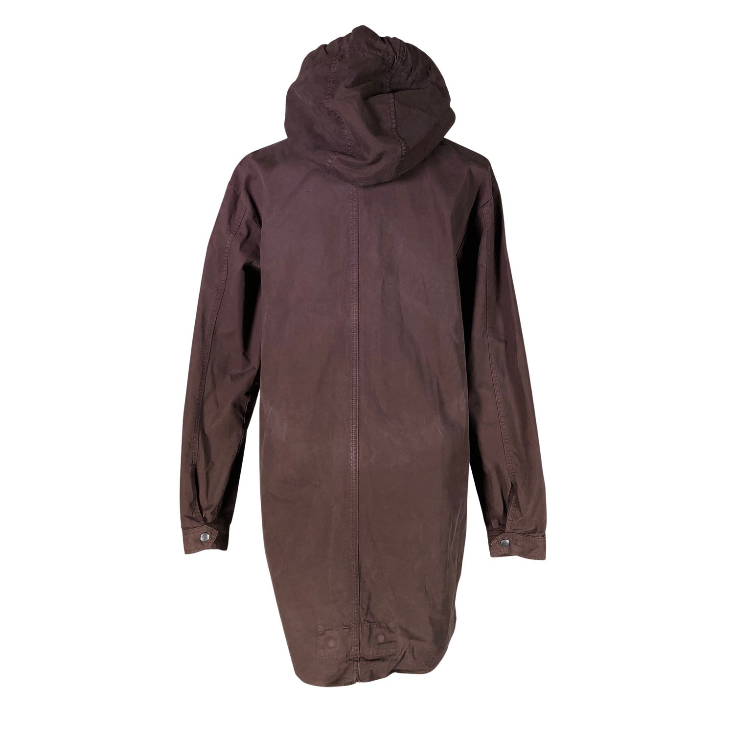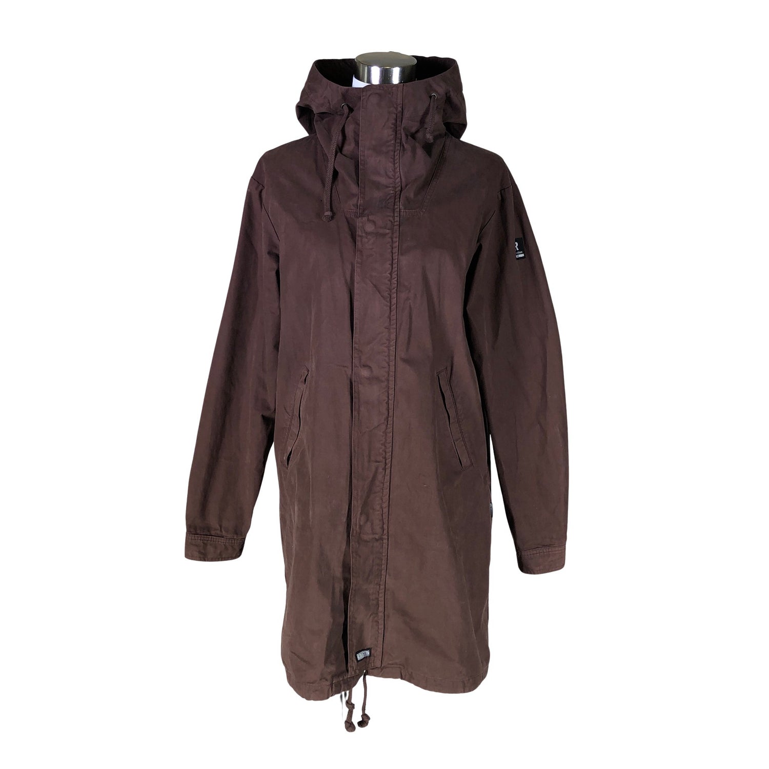 Puuvillaa. Pitkä malli. Korkea kaulus. Tuotteen taskuissa on vetoketjut. Tuotteessa ei ole vuorta. Tuotteen pinnassa on hieman pesu-/käyttökulumaa. Yleisilme on siisti.