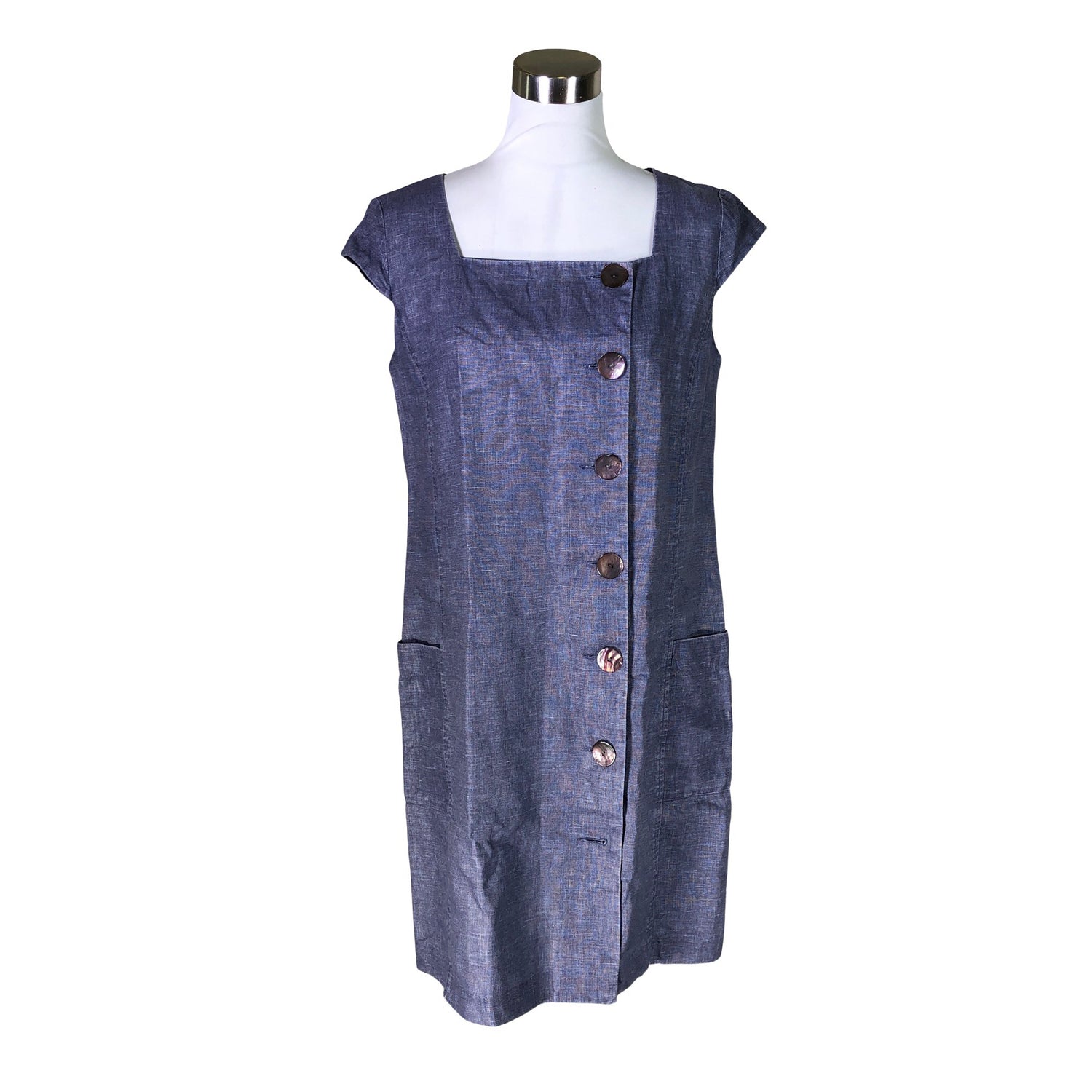 Pellavaa. Materiaali ei jousta. Tuotteen pinnassa on aavistus pesu-/käyttökulumaa. Tuotteesta puuttuu nappi, varanappi on mukana. Tuote on muilta osin hyvässä kunnossa.