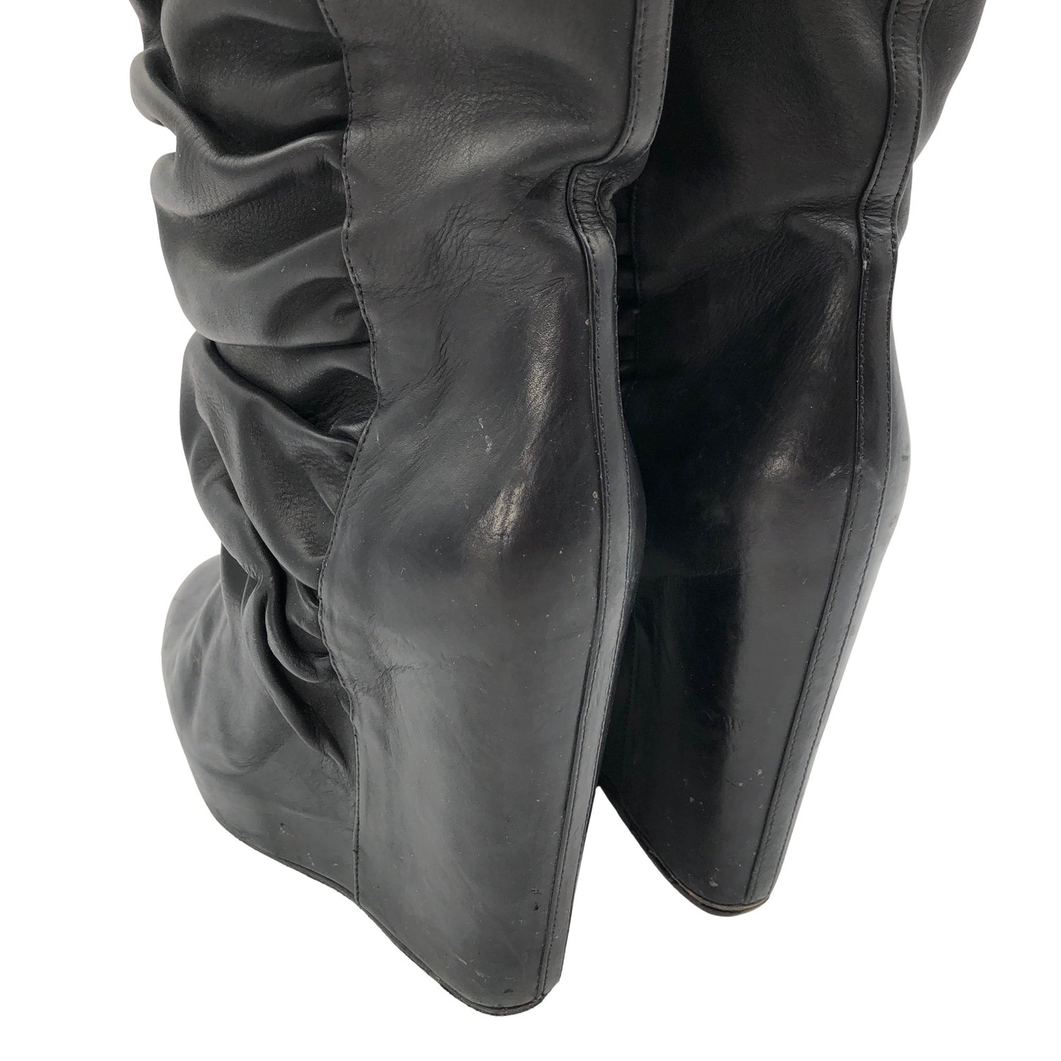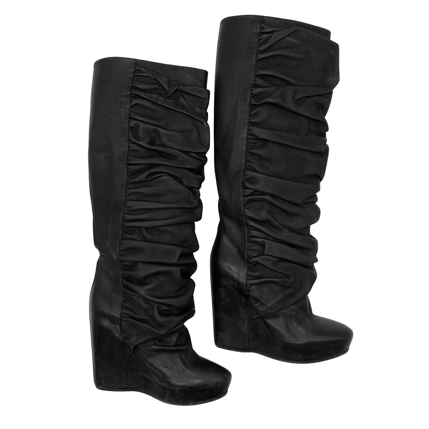 Malli: Draped Wedge Pull On Boot. Materiaalitieto puuttuu. Todennäköisesti nahkaa. Kiilakorko. Korkeat korot (yli 8 cm). Mukana alkuperäinen pakkaus. Tuotteen pinnassa on pieni nirhauma. Tuotteen pinnassa on hieman pesu-/käyttökulumaa. Yleisilme on siisti.