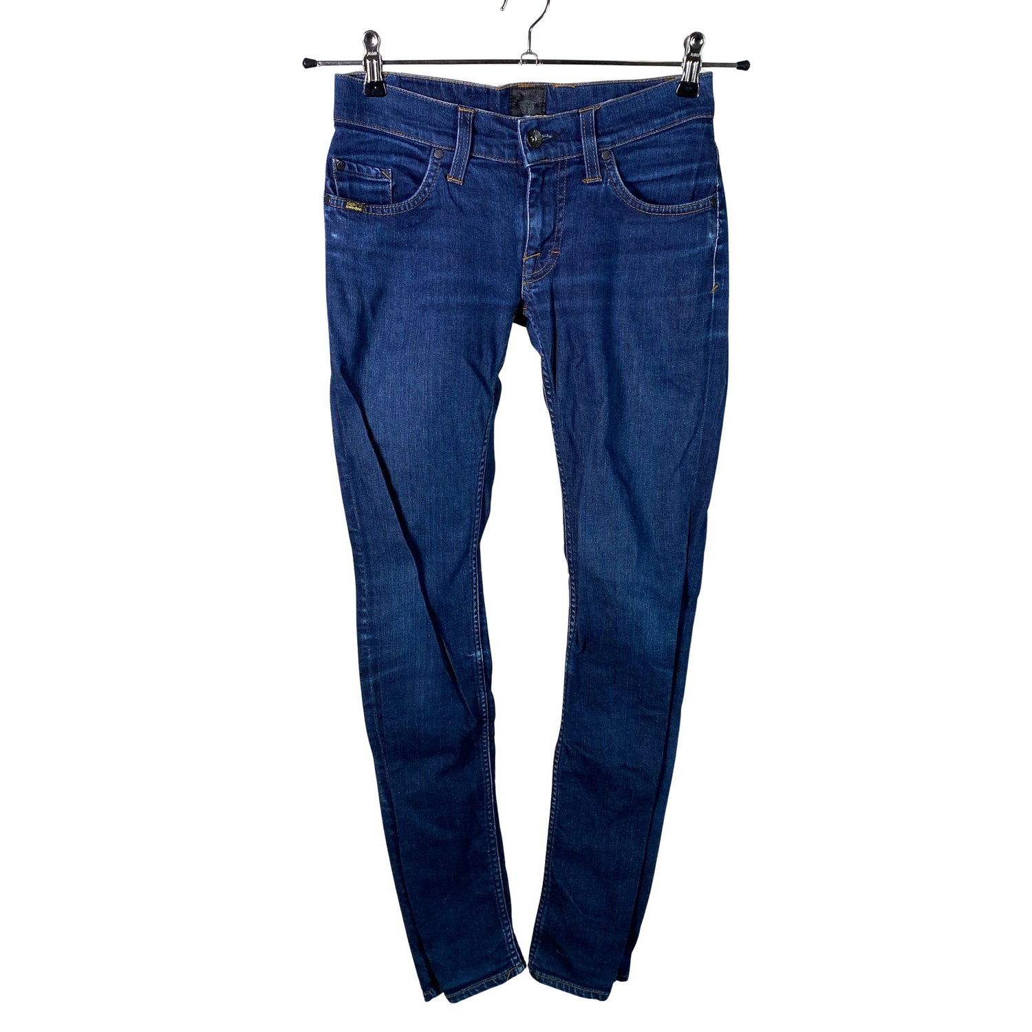 Malli: Skinny. Materiaali joustaa hieman. Matala vyötärö. Tuotteen pinnassa on pesu-/käyttökulumaa. Yleisilme on siisti.