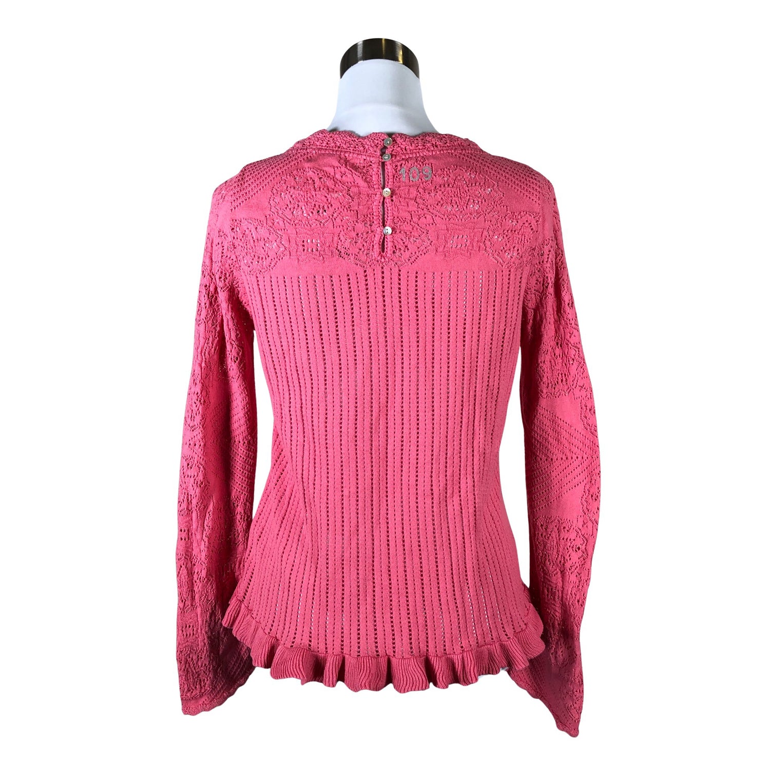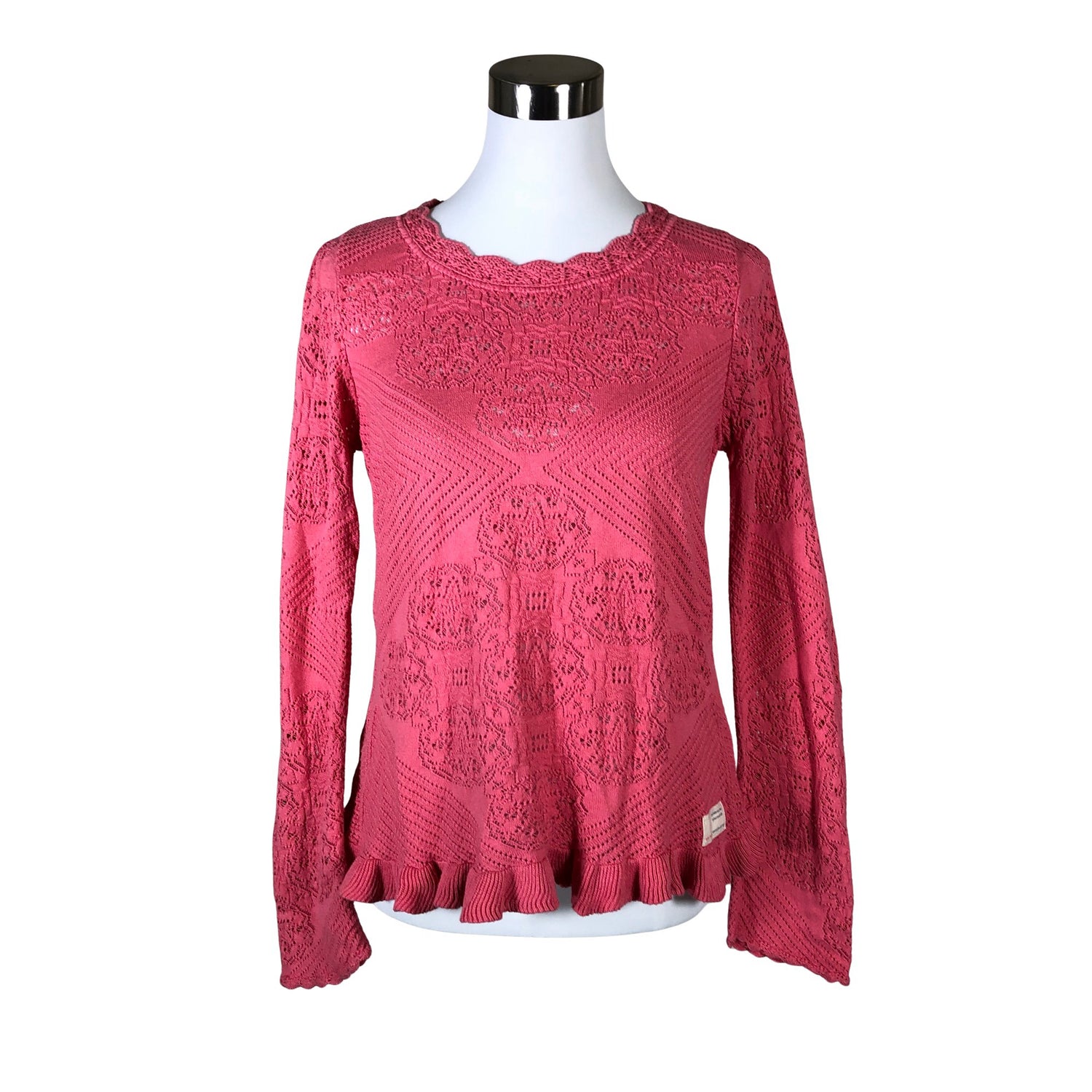 Pitsineulosta. Peplum-helma. Materiaali joustaa. Tuotteen pinnassa on hieman pesu-/käyttökulumaa. Yleisilme on siisti.