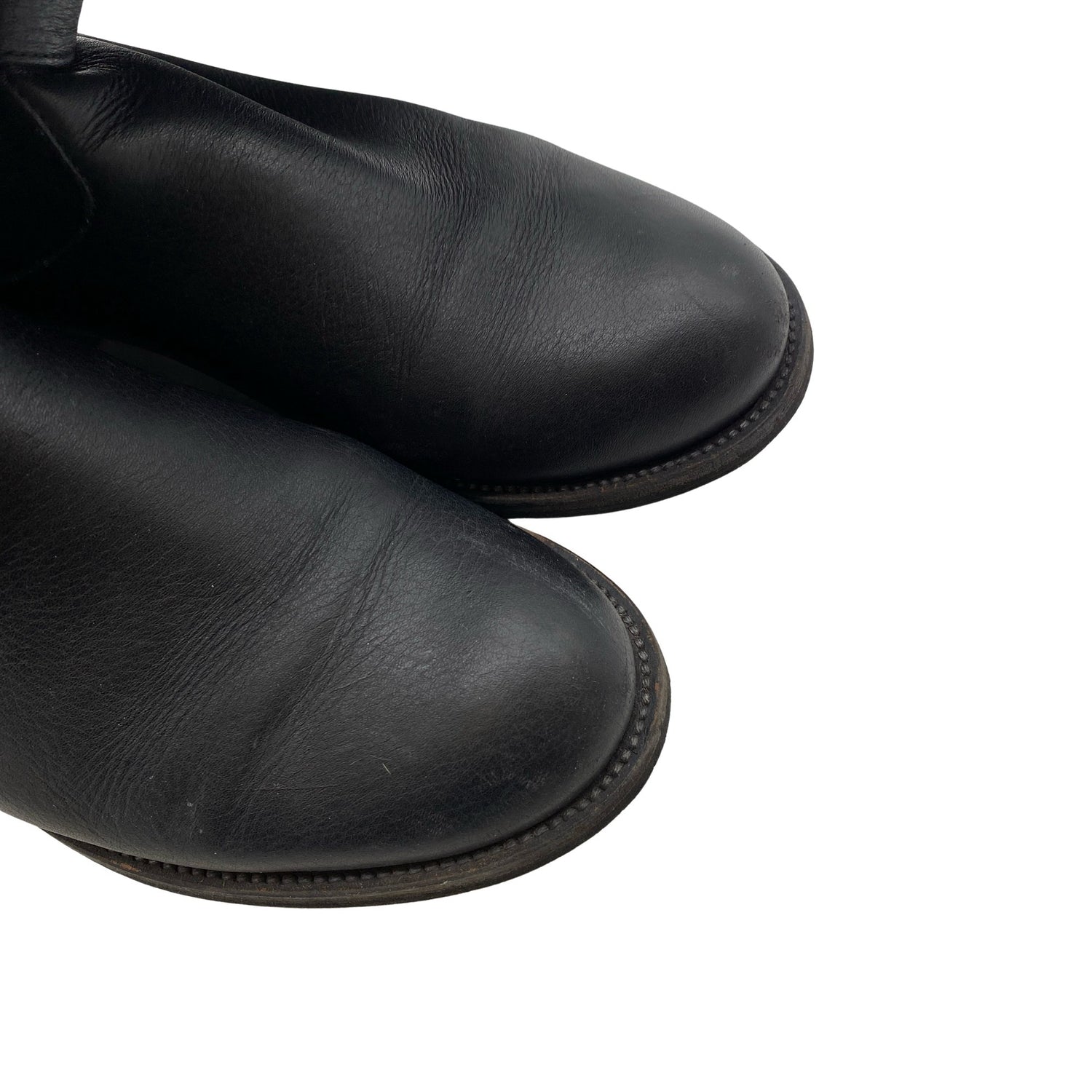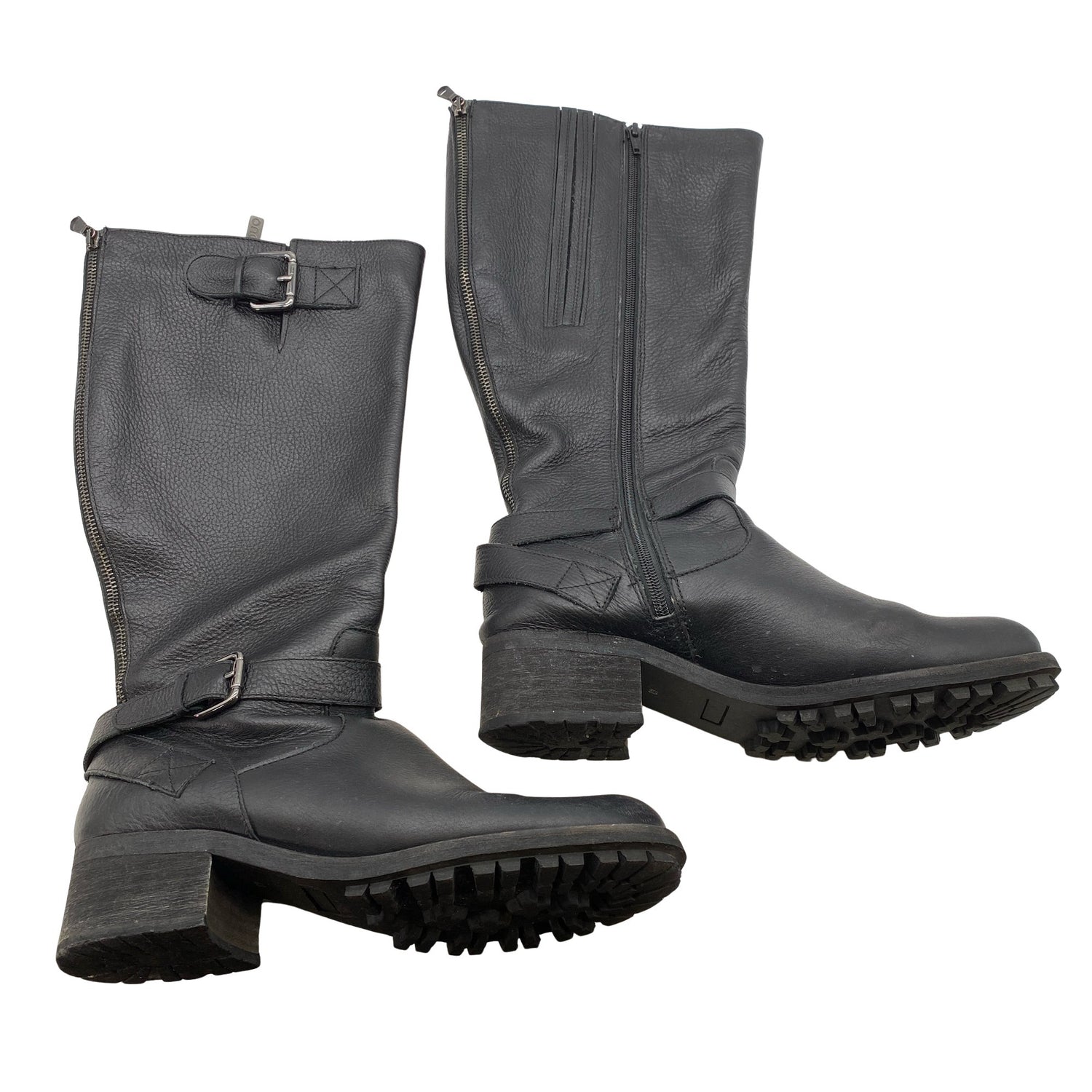 Materiaalitieto puuttuu. Todennäköisesti nahkaa. Varsi joustaa hieman. Sivusaumoissa on vetoketjut. Tuotteen sisäpuolella on hieman kulumaa. Tuotteen sisäpuolella on hieman tummentumaa. Tuotteen pinnassa on hieman pesu-/käyttökulumaa. Yleisilme on siisti.