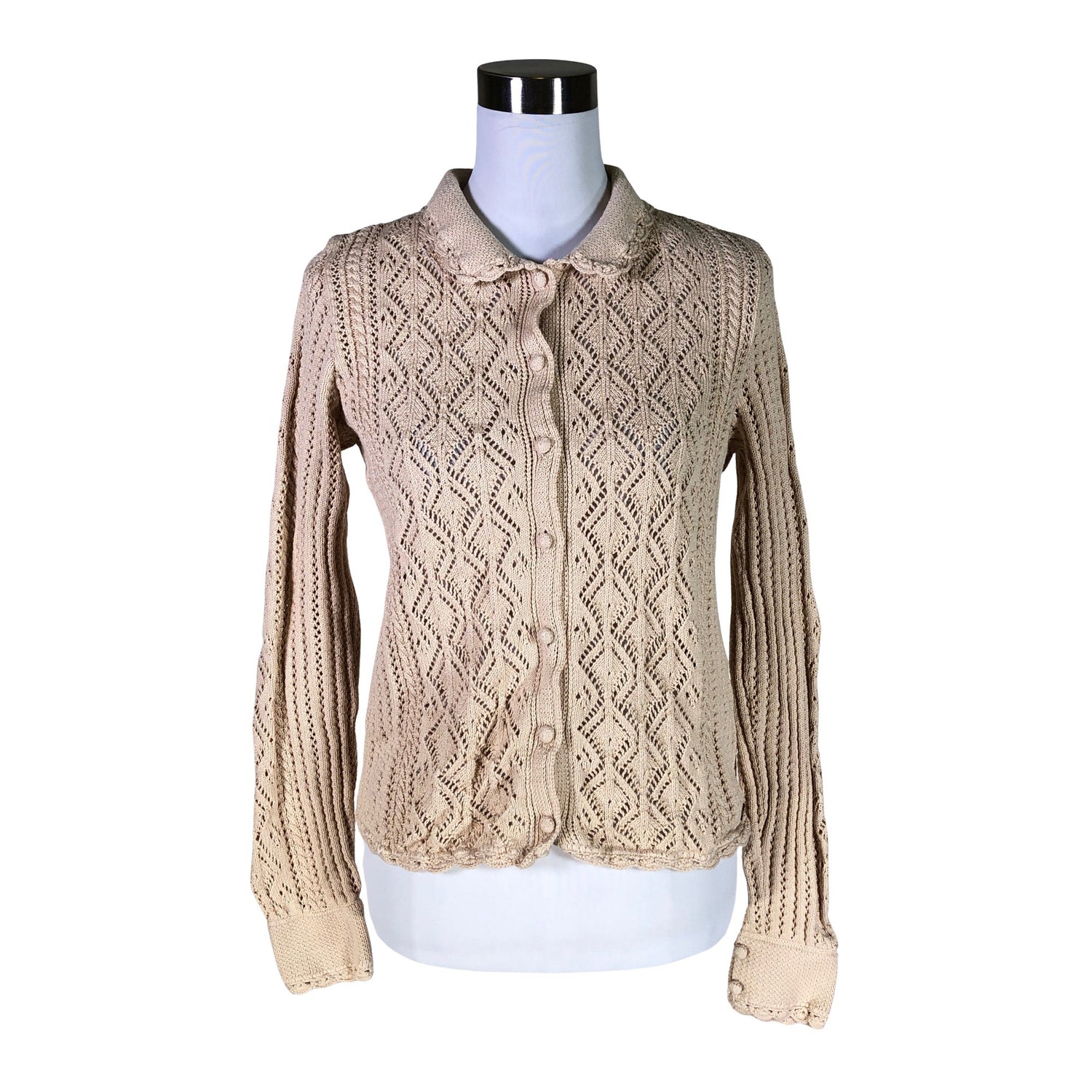 Luomupuuvillaa. Harvaa neulosta. Materiaali joustaa hieman. Edessä napit.