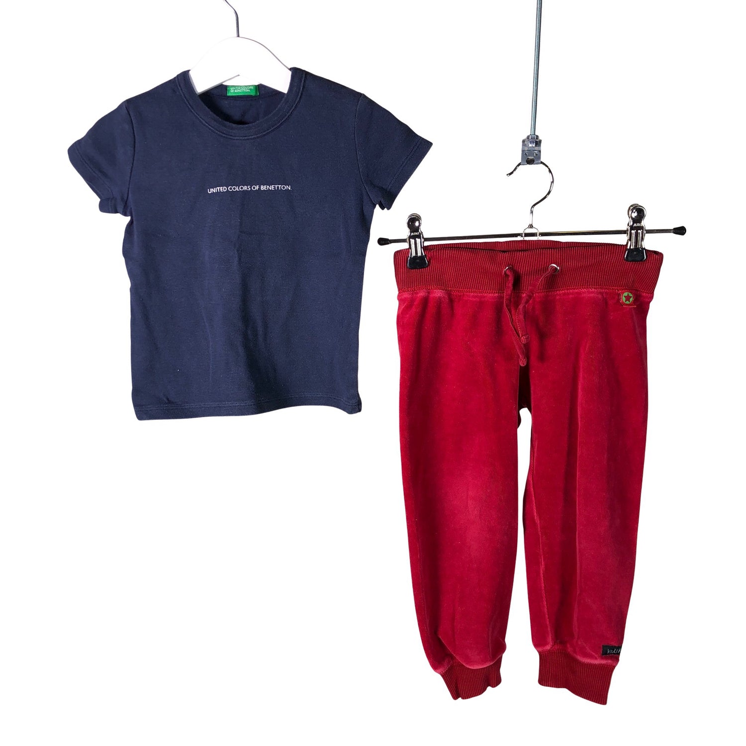 Villervalla Collegehousut, koko 86 - 92. Setti: Villervalla & Benetton. Tuotteen pinnassa on hieman pesu-/käyttökulumaa. Yleisilme on siisti.