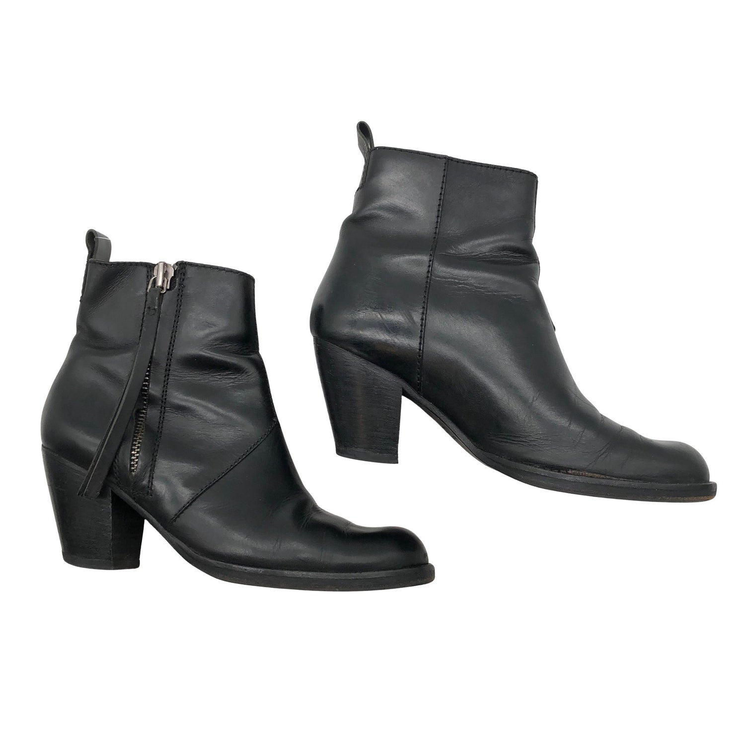 Nahkaa. Sivusaumoissa on vetoketjut. Kenkien koroissa on hieman kulumaa. Tuotteen pinnassa on aavistus pesu-/käyttökulumaa. Yleisilme on siisti.