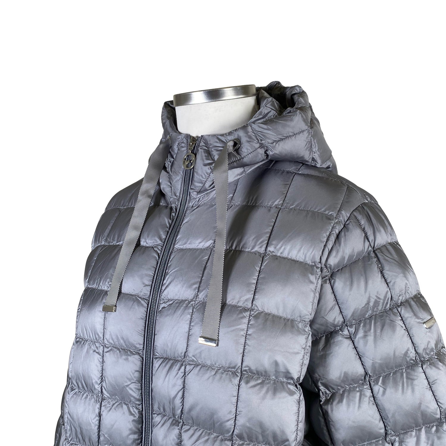 Kevyesti topattu. Sivusaumoissa on halkiot. Tuotteen pinta on liukasta materiaalia. Tuotteessa on kaksisuuntainen vetoketju.
