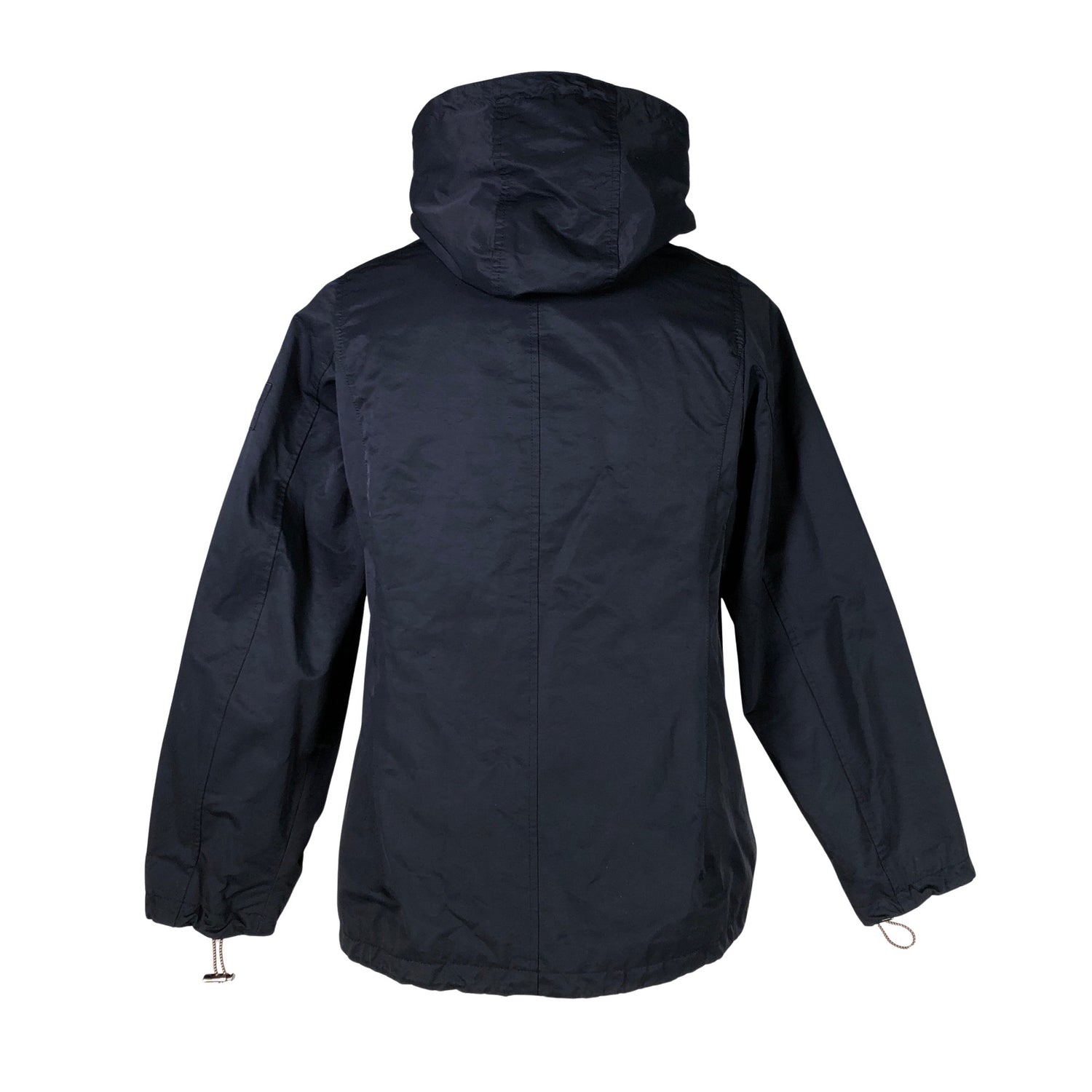 Materiaali ei jousta. Tuotteessa on ohut vuori. Tuotteessa on kiristysnyöri helmassa. Korkea kaulus. Tuotteen sisäpuolella on haalea tahra. Tuotteen pinnassa on muutama haalea tahra. Lähtee todennäköisesti pesussa. Tuote on muilta osin hyvässä kunnossa.