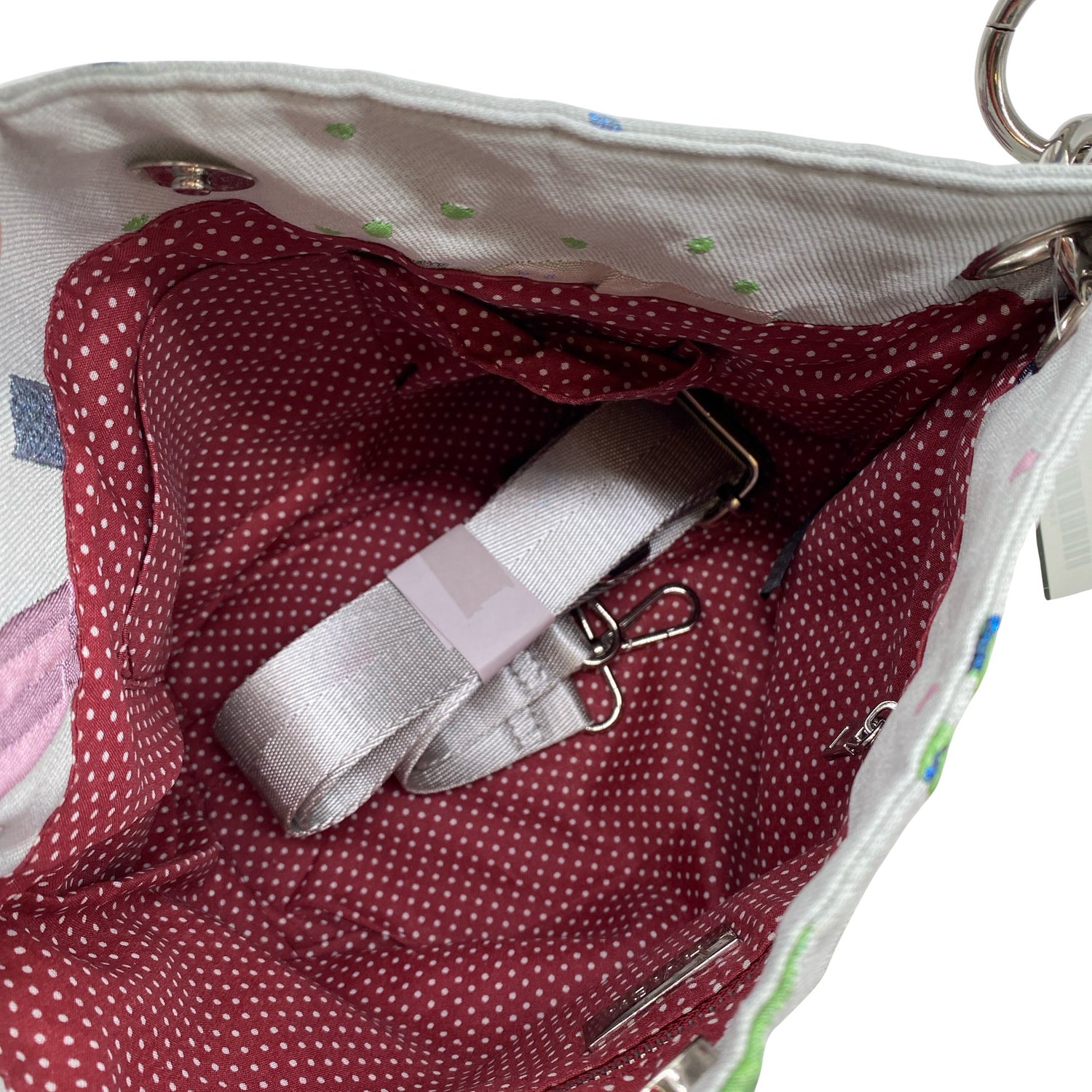 Tekstiiliä. Irrotettava olkahihna/rannelenkki. Tuotteen pinnassa on aavistus pesu-/käyttökulumaa. Tuotteen pinnassa on muutama tahra. Yleisilme on siisti.