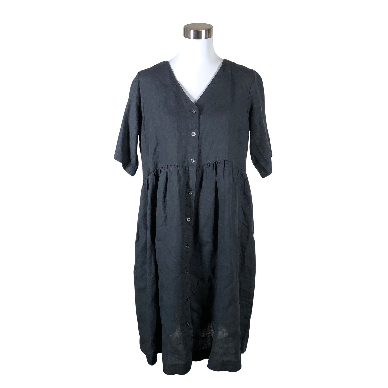Pellavaa. Edessä napit. Vaatteessa on taskut. Materiaali ei jousta.