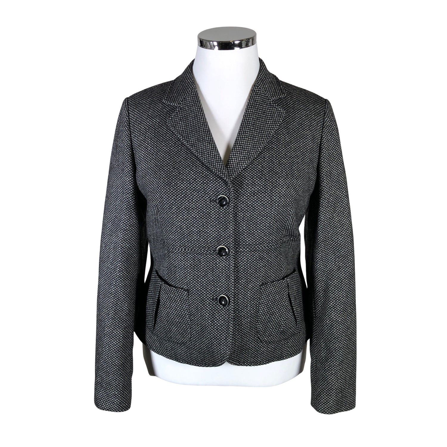 Olkatoppaukset. Tuotteessa on ohut vuori. Villasekoitetta. Vaatteessa on taskut. Tuotteen sisäpuolella on hieman tummentumaa. Tuotteen pinnassa on hieman pesu-/käyttökulumaa. Yleisilme on siisti.