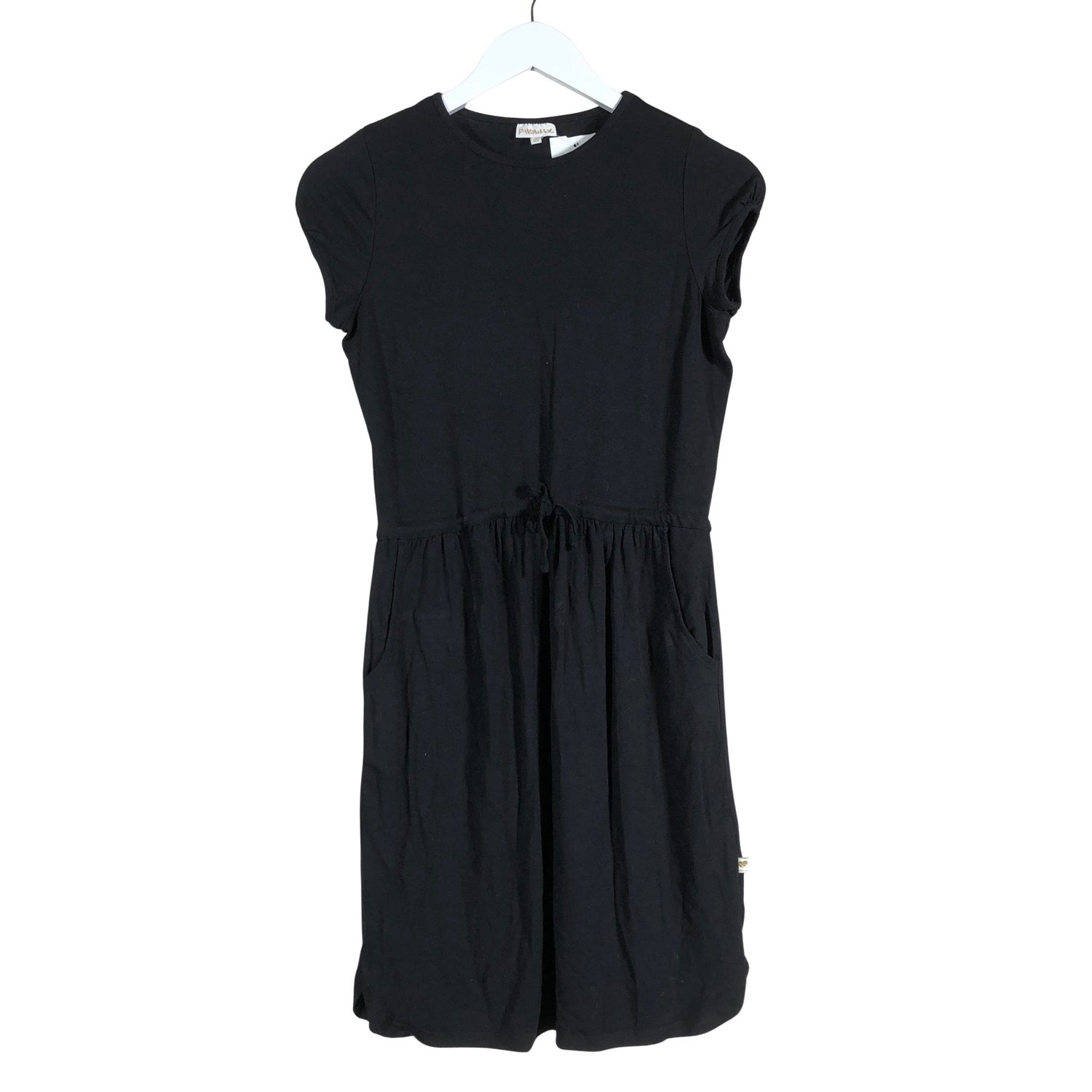 Kiristysnauha vyötäröllä. Vaatteessa on taskut. Materiaali joustaa. Tuotteen pinnassa on hieman pesu-/käyttökulumaa. Yleisilme on siisti.
