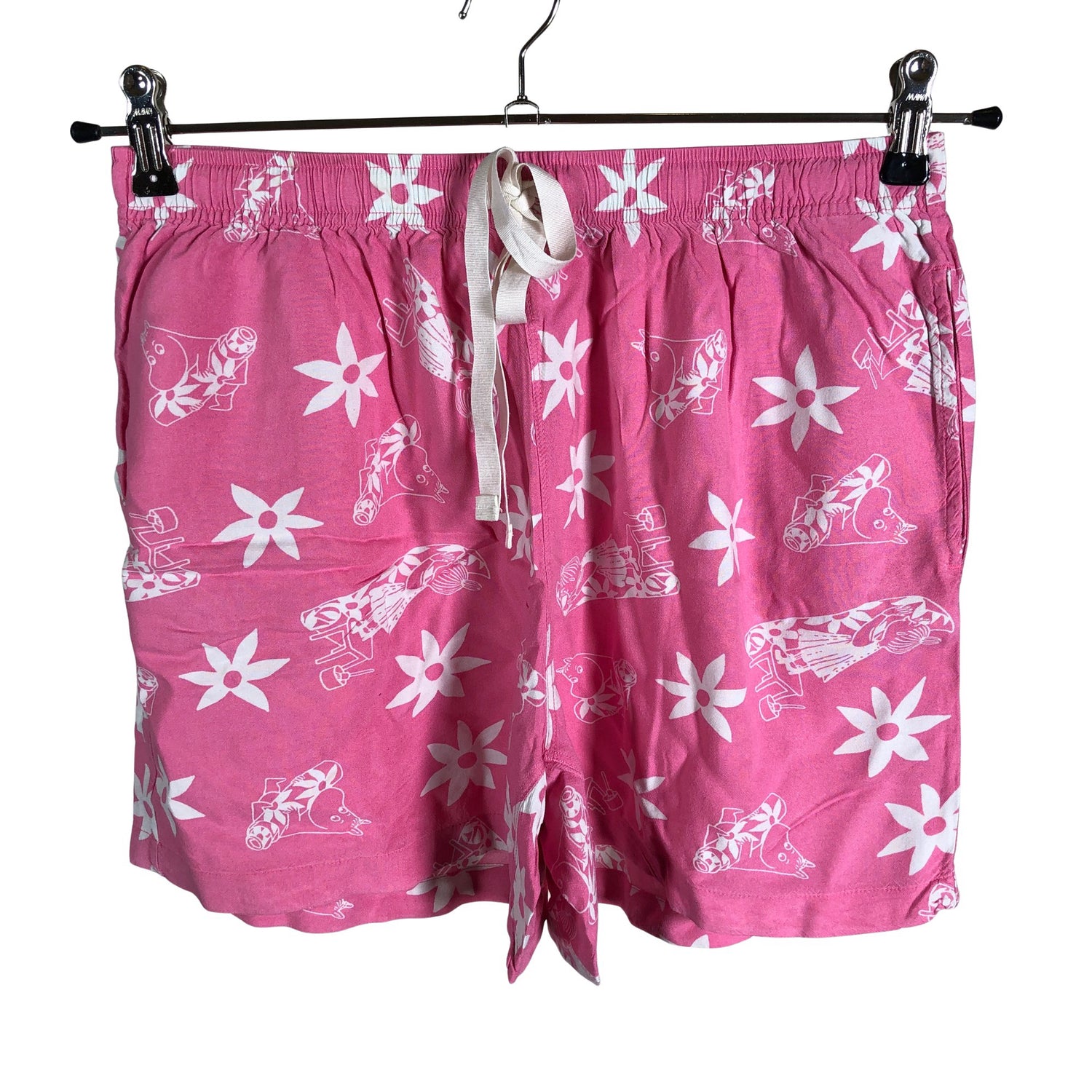 Joustava vyötärö. Kiristysnauha vyötäröllä. Ohutta materiaalia. Tuotteen pinnassa on aavistus pesu-/käyttökulumaa. Yleisilme on siisti.