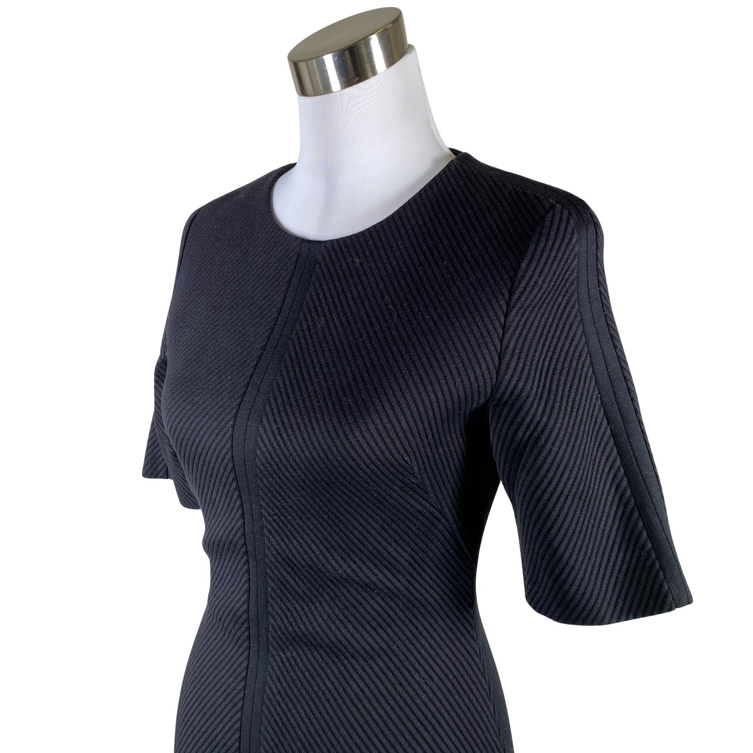 Vartalonmyötäinen malli. Vajaamittaiset hihat. Vetoketju takana. Tuotteessa on ohut vuori.