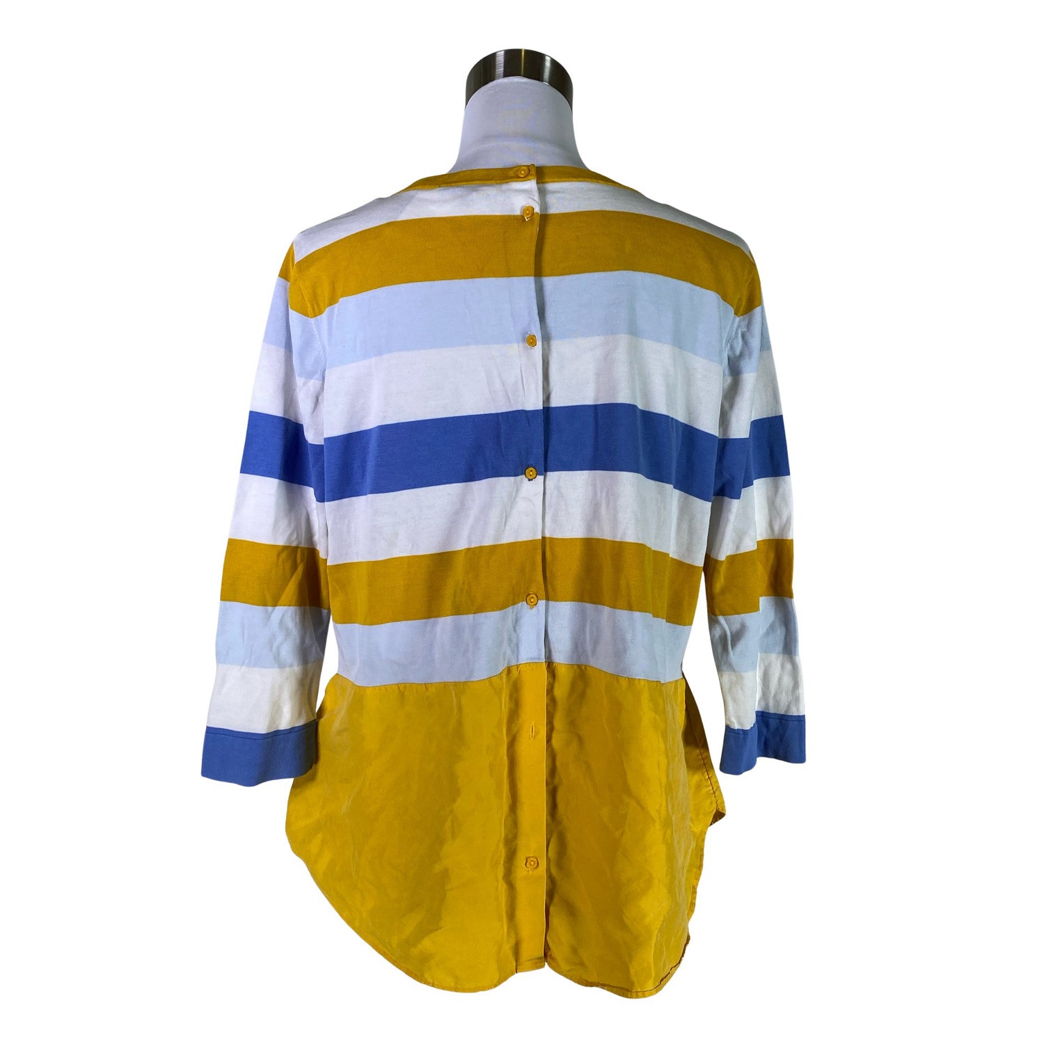 Tuotteen ylä- ja alaosa ovat eri materiaalia. Takana napit. Ohutta neulosta. Materiaali joustaa. Tuotteen pinnassa on hieman pesu-/käyttökulumaa. Tuotteen pinnassa on aavistus tummentumaa. Yleisilme on siisti. Tuotteesta puuttuu nappi, varanappi on mukana.