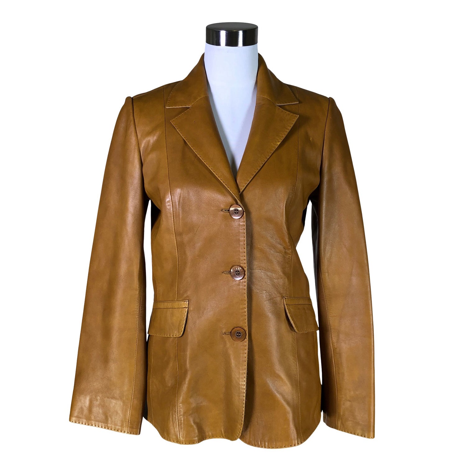 Nahkaa. Olkatoppaukset. Tuotteessa on ohut vuori. Kauluksessa on hieman kulumaa. Tuotteen pinnassa on aavistus pesu-/käyttökulumaa. Tuote on muilta osin hyvässä kunnossa.