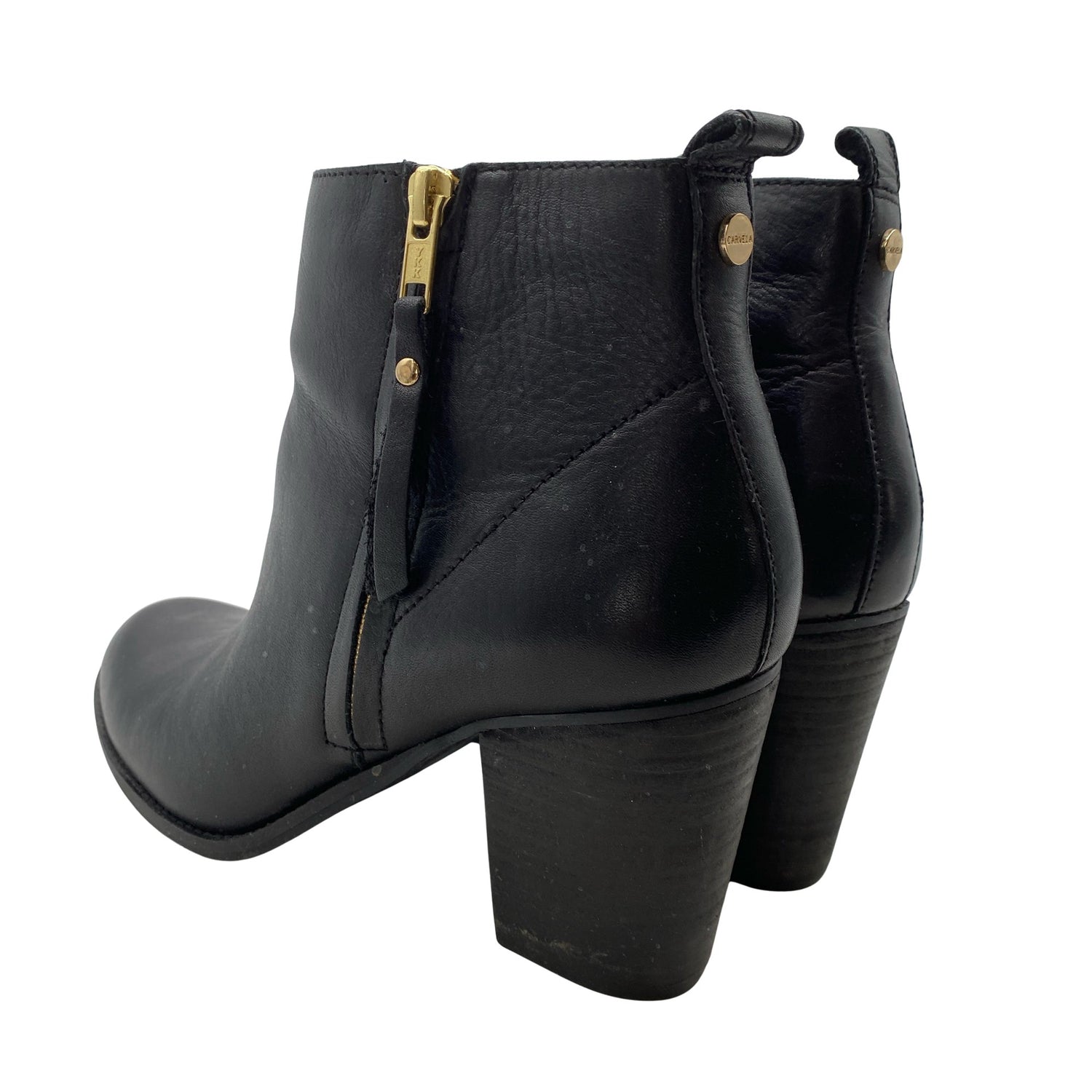 Nahkaa. Sivusaumoissa on vetoketjut. Korkeat korot (yli 8 cm).