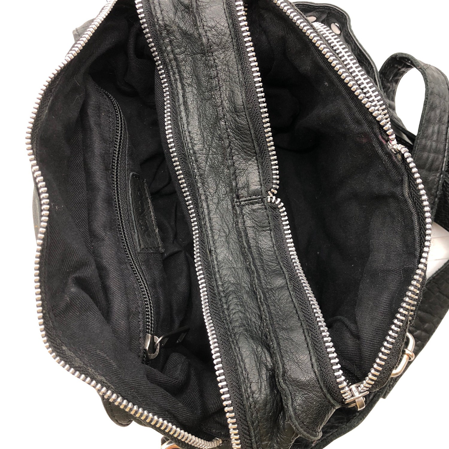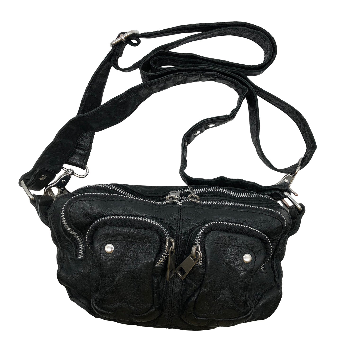Materiaalitieto puuttuu. Todennäköisesti nahkaa. Irrotettava olkahihna/rannelenkki. Olkahihnan pituus on säädettävissä. Crossbody. Tuotteen taskuissa on vetoketjut. Tuotteen pinnassa on hieman pesu-/käyttökulumaa. Yleisilme on siisti.