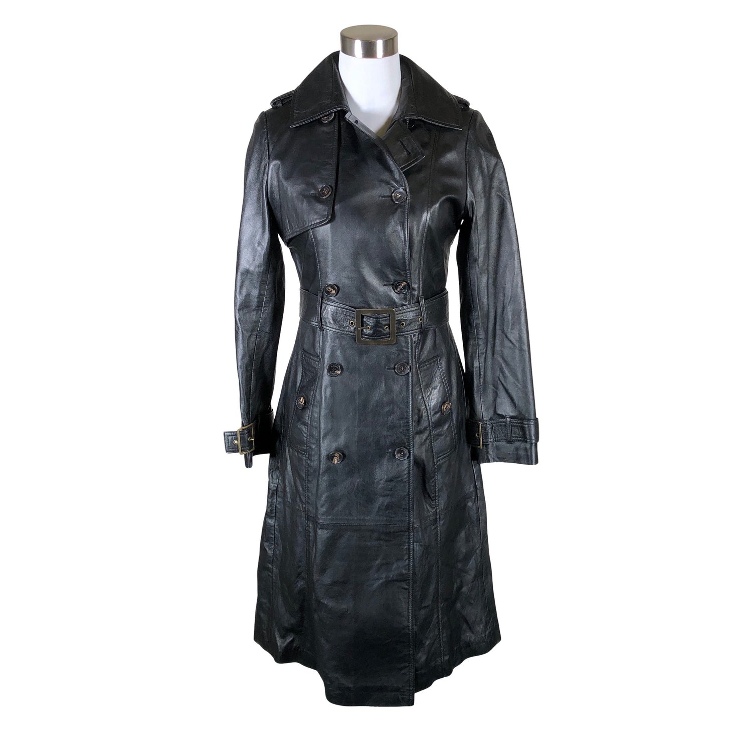 Tuotteessa on ohut vuori. Tuotteeseen kuuluu vyö. Vaatteessa on taskut. Materiaalitieto puuttuu. Todennäköisesti nahkaa. Tuotteen pinnassa on aavistus pesu-/käyttökulumaa. Yleisilme on siisti.