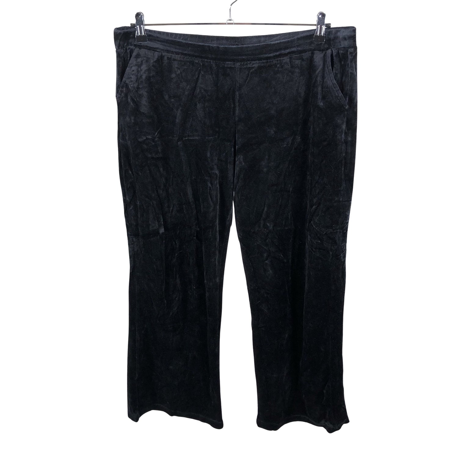 Velouria. Leveät lahkeet. Vaatteessa on taskut. Materiaali joustaa. Tuotteen pinnassa on hieman pesu-/käyttökulumaa. Yleisilme on siisti.
