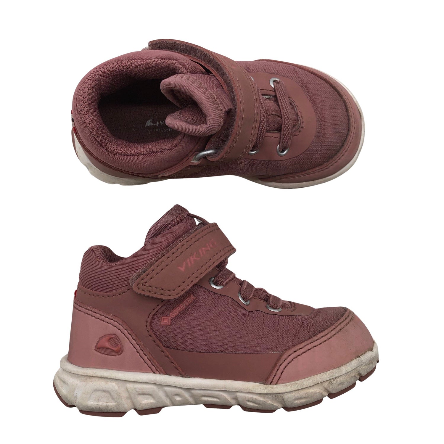 Tuotteessa on tarrakiinnitys. Gore-Tex -merkintä. Tuotteen pinnassa on hieman käyttölikaa. Lähtee todennäköisesti pesussa. Kenkien kärjissä on kulumaa. Yleisilme on siisti.